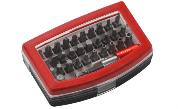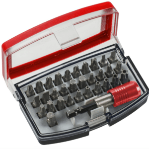 Das 32-teilige Bit-Set bringt alles mit, was ihr für Schraubarbeiten braucht. In einer stabilen Kunststoff-Box verpackt, ist es nicht nur gut sortiert, sondern dank des praktischen Gürtelclips auch immer griffbereit.
