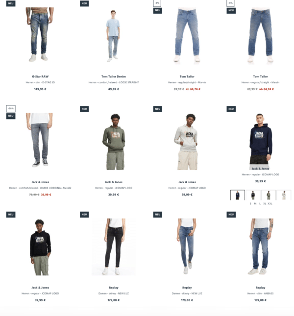 Entdecke eine riesige Auswahl an Jeans, Shirts, Jacken und mehr. Bei fast 4000 Artikeln wirst du definitiv fündig! Top Marken wie G Star, Tom Tailor sind natürlich mit dabei.