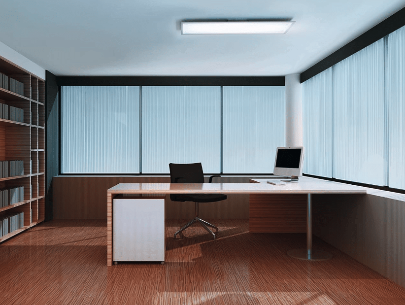 Ein Büro mit Schreibtisch über welchem die LEDVANCE LED Deckenleuchte an der Decke hängt