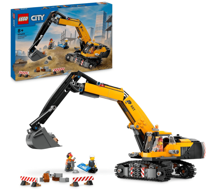 Das Set richtet sich an Kinder ab 8 Jahren und enthält nicht nur einen detailreichen Bagger, sondern auch nützliches Baustellenzubehör wie Absperrungen, eine Bauzeichnung, einen Presslufthammer, ein Funkgerät und drei Figuren.
