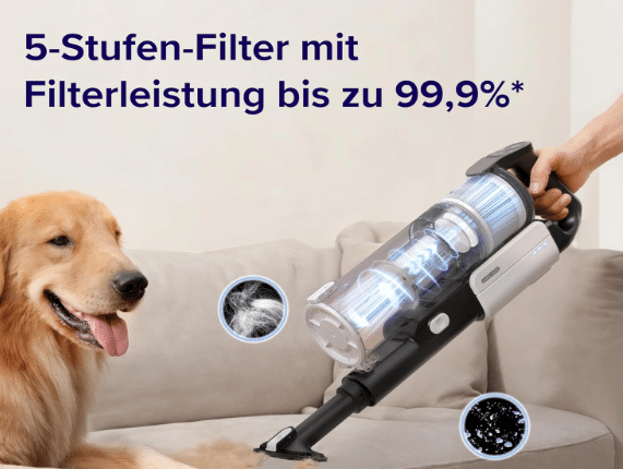 Der Levoit Akkustaubsauger LVAC-200 erleichtert den Alltag, insbesondere für Haushalte mit Haustieren oder Allergien. Dank der TÜV-zertifizierten Anti-Haar-Verwicklungstechnologie bleiben Haare nicht mehr an der Bürste hängen, was besonders praktisch ist, wenn flauschige Vierbeiner im Haus sind. Das leistungsstarke Filtersystem fängt 99,9% der feinen Partikel ein und sorgt so für saubere Luft. Mit dem fünfstufigen Filtersystem wird eine optimale Filterleistung gewährleistet.