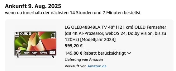 Wenn der Filmabend zu Hause das Highlight ist und ihr dabei nicht auf Kinoqualität verzichten wollt, könnte der LG B49 OLED TV genau das Richtige für euch sein. Bei Amazon bekommt ihr den hochwertigen OLED48B49LA gerade dank Direktabzug an der Kasse für nur noch 599,20€ inkl. Versand statt woanders ab 749€.