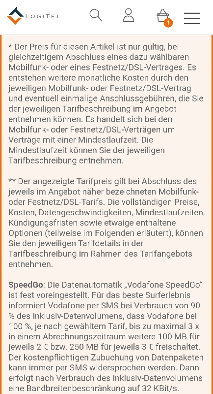 Der Preis für diesen Artikel ist nur gültig, bei gleichzeitigem Abschluss eines dazu wählbaren Mobilfunk- oder eines Festnetz/DSL-Vertrages.