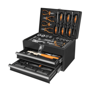 Die Werkzeugbox ist aus robustem Stahlblech gefertigt, was sie langlebig macht und dank ihrer kompakten Abmessungen von circa 40 x 28 x 27 cm sowie einem Gewicht von etwa 10 kg lässt sie sich leicht transportieren.