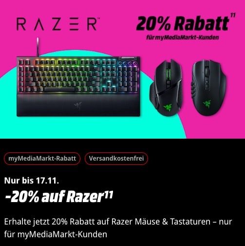 Bei Mediamarkt gibt es aktuell 20% auf diverse Razer Produkte! Hier sind wirklich eine Produkte mit starken Preisen am Start! Von Tastaturen bis Mäusen ist hier alles dabei! Die Aktion gilt nur für eingeloggte myMediaMarkt-Kunden, die Mitgliedschaft ist aber kostenlos. 🙂