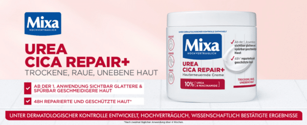 Leidet ihr unter trockener, spröder Haut oder rauen Stellen und sucht nach einer effektiven Pflege für Gesicht, Körper und Hände? Dann schaut euch das Angebot bei Amazon an: Die Mixa Urea Cica Repair+ (400 ml) gibt es aktuell für nur 5,34€! Um diesen Preis zu erzielen, aktiviert einfach das Sparabo, das ihr nach Erhalt der Lieferung problemlos wieder kündigen könnt.