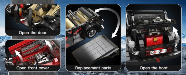 Die klassischen Elemente wie Kotflügel, Scheinwerfer und Motor sind genau nachgebildet und verleihen dem Modell ein realistisches Aussehen. Das Bauspielzeug besteht aus umweltfreundlichen ABS-Materialien und natürlichen Tonerrohstoffen.