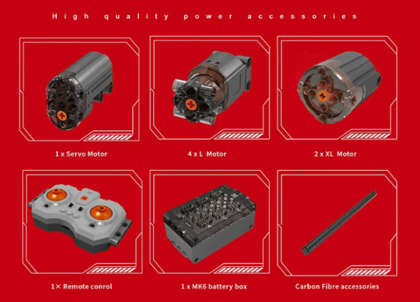 Was die Technik angeht, so sorgen ein Servo Motor, vier L Motoren und zwei XL Motoren für reichlich Bewegung. Diese werden durch eine Fernbedienung und eine MK6 Batteriebox ergänzt.