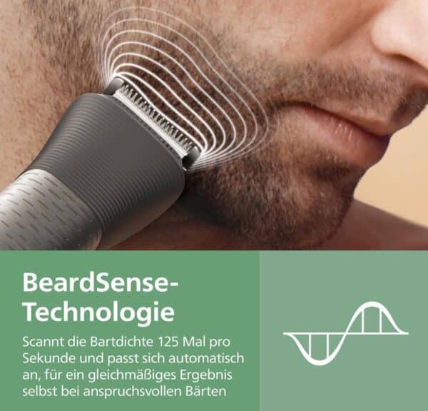Die innovative BeardSense-Technologie passt sich automatisch an die Dichte eures Bartes an und liefert ein gleichmäßiges Trimmergebnis. Bei der Gestaltung von scharfen Konturen kommen der schmale Detailtrimmer und der Metalltrimmer zum Einsatz, die euch helfen, präzise Linien und Details zu erzielen. Der ergonomische Griff unterstützt bei der Handhabung und ermöglicht eine sichere Führung des Trimmers.