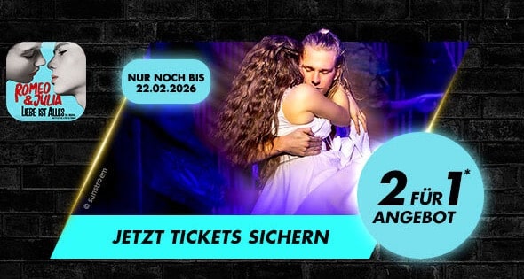 Das Angebot für ROMEO UND JULIA – Liebe ist alles sowie & JULIA – Das Pop-Musical gilt bis zum 31.12.2025. Alle Ermäßigungen werden nur auf den im Endpreis enthaltenen Ticketpreis gewährt – im Endpreis enthaltene Festgebühren (€ 8,65) werden nicht reduziert.