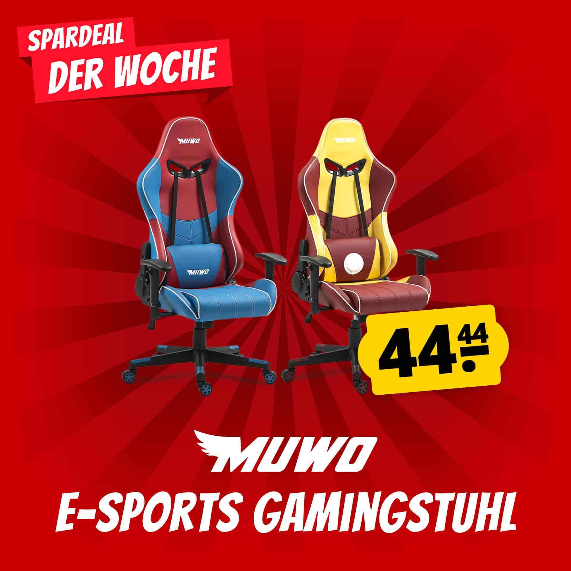 Der perfekte Gamingstuhl für lange Sessions oder produktives Arbeiten! Aktuell gibt es den MUWO „Hero“ E-Sports Gamingstuhl in der Farbkombination Gelb/Rot für unschlagbare 44,44€ 69,60€.