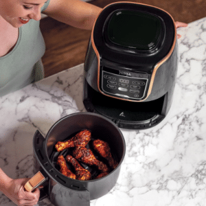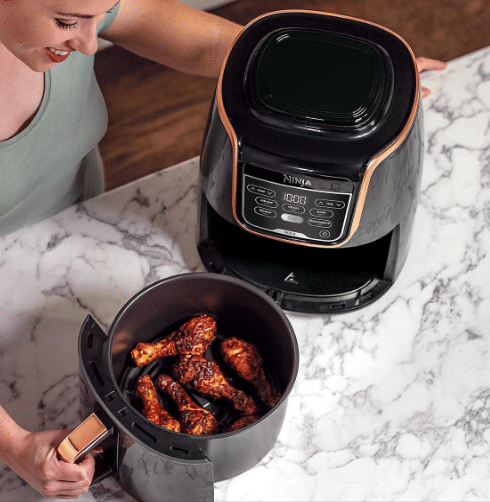 Entdeckt den Ninja Air Fryer MAX in elegantem Kupfer-Schwarz-Design, exklusiv bei Amazon. Spart mit diesem Küchenhelfer bis zu 55% Energiekosten im Vergleich zu konventionellen Backöfen. Dank Heißlufttechnologie könnt ihr eure Speisen mit 75% weniger Fett genießen. Der 5,2 Liter fassende Korb eignet sich prima für bis zu 1,4 kg Pommes.