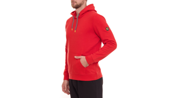 Die Kapuze mit Kordelzug lässt sich individuell anpassen, während die innenseitig gebürstete Kängurutasche für warme Hände sorgt.