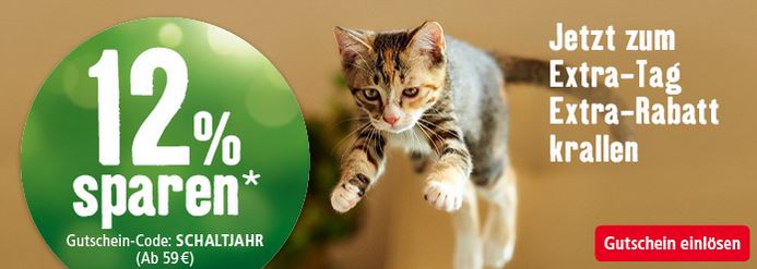 Ihr habt einen vierbeinigen Mitbewohner? Dann schaut mal bei Fressnapf vorbei, dort bekommt ihr gerade 12% Rabatt auf das gesamte Sortiment mit dem Code „SCHALTJAHR„. Der Mindestbestellwert beträgt nur 59€ und die Versandkosten sind schon ab 29€ geschenkt.