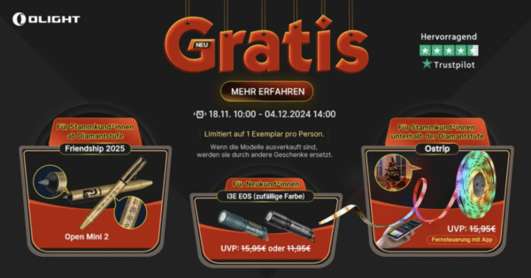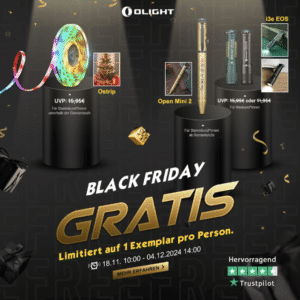 Auch bei Olight sind die Black Weeks in vollem Gange und das heißt für euch Geschenke-Time! Um genauer zu werden hat Olight drei verschiedene „Geschenke“ am Start, je nach Kundenstatus. Alle Angebote kosten jeweils 0€ + Versand (5,95€).