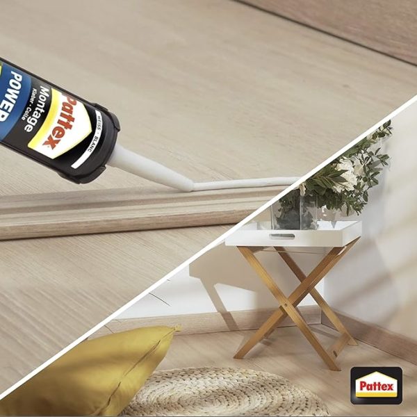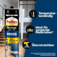 „Insbesondere Verklebungen auf saugenden Untergründen wie Beton oder Innenputz erfordern besonderen Halt. Der Pattex Montagekleber Power ist die perfekte Lösung für starke und kraftvolle Befestigungen sowohl im Innen- als auch im Außenbereich*. Der Kleber eignet sich für vielfältige Untergründe** und kann z.B. zum Befestigen von keramischen Fliesen oder Dekorplatten verwendet werden. Er gleicht kleinere Unebenheiten aus und ist einfach überstreichbar.“