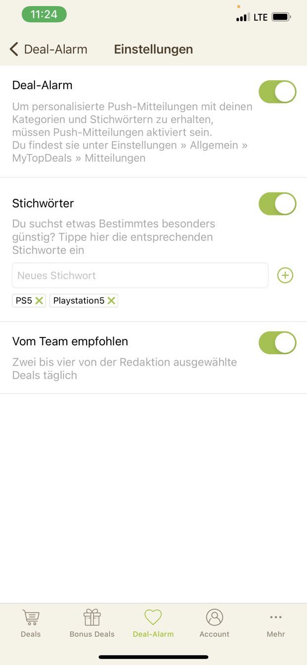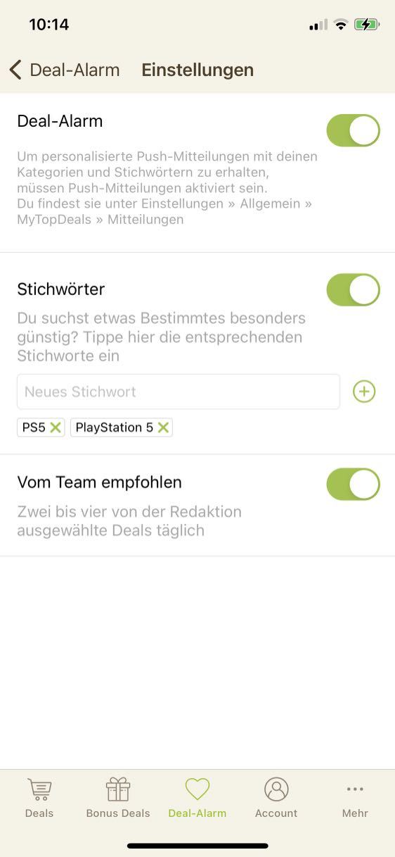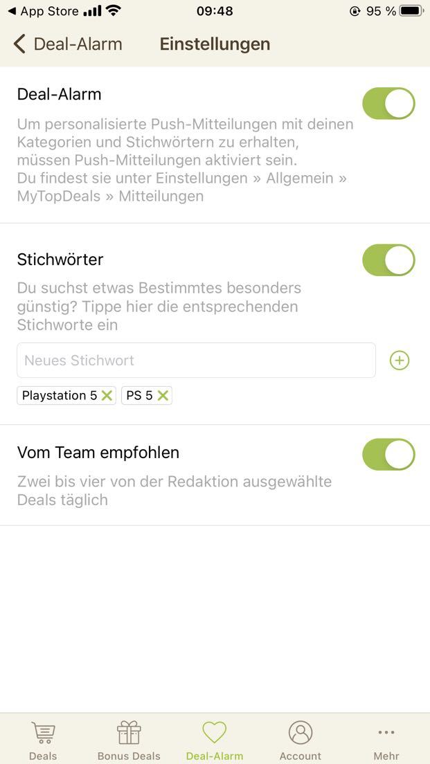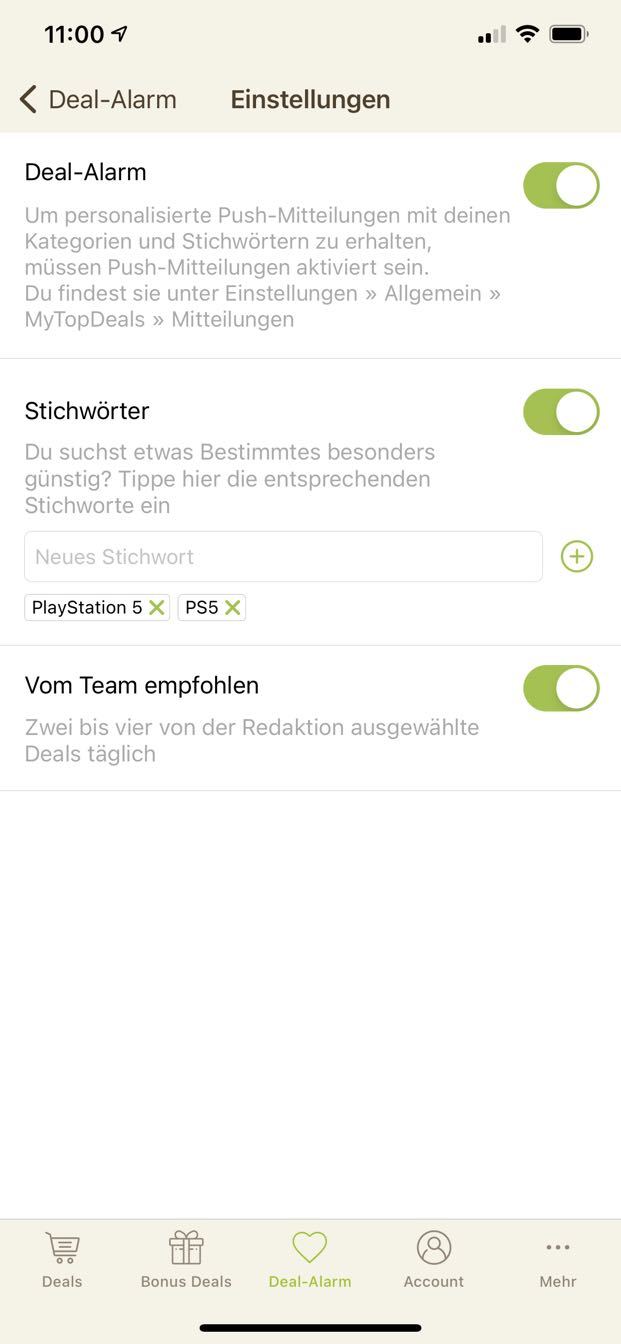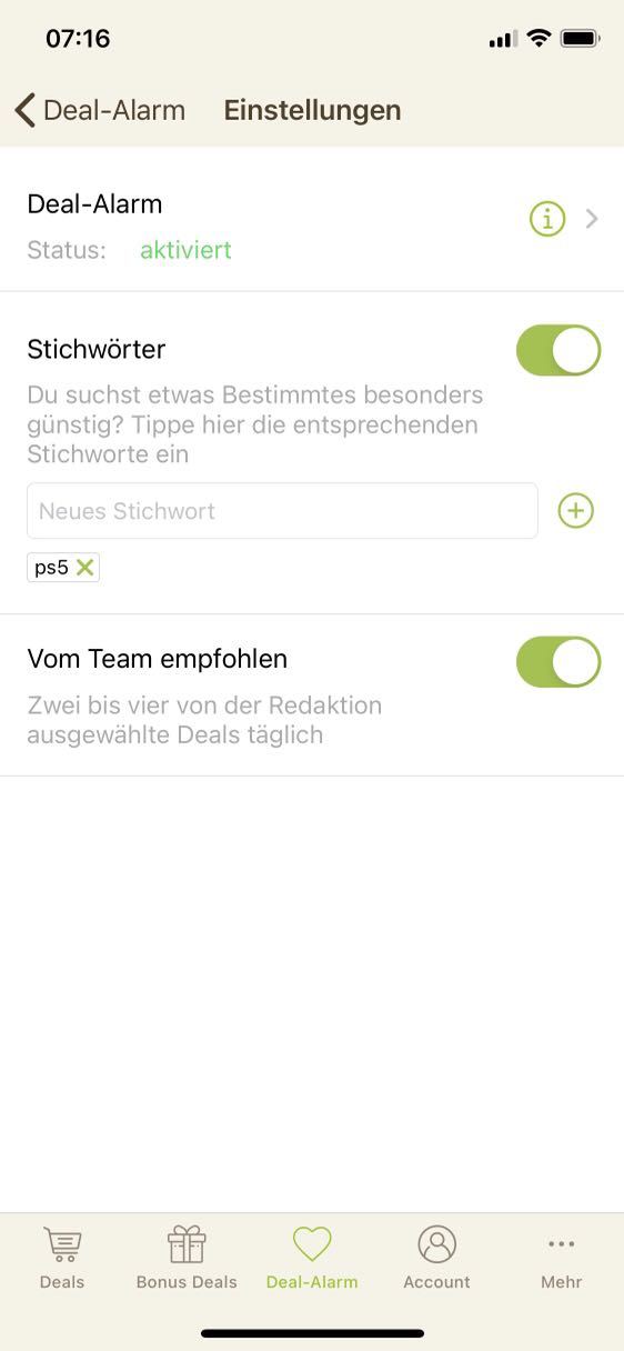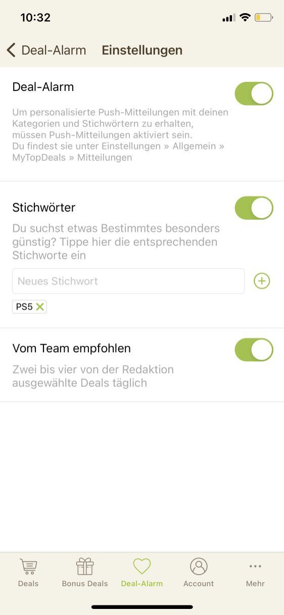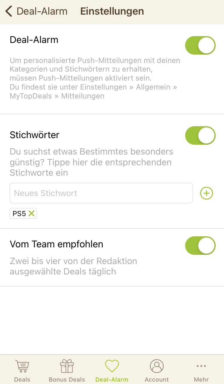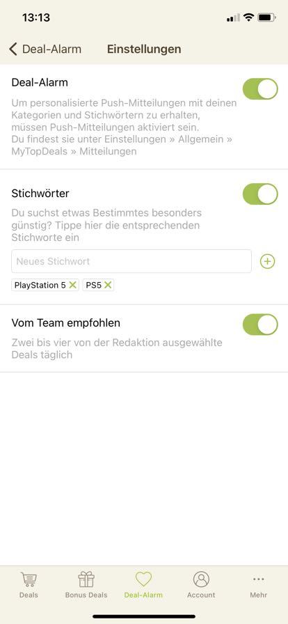 • iPhone: Deal-Alarm (Mitte unten) > Zahnrad (rechts oben) > Stichwörter hinzufügen - Stichwort-Screenshot hier als Kommentar einsenden!