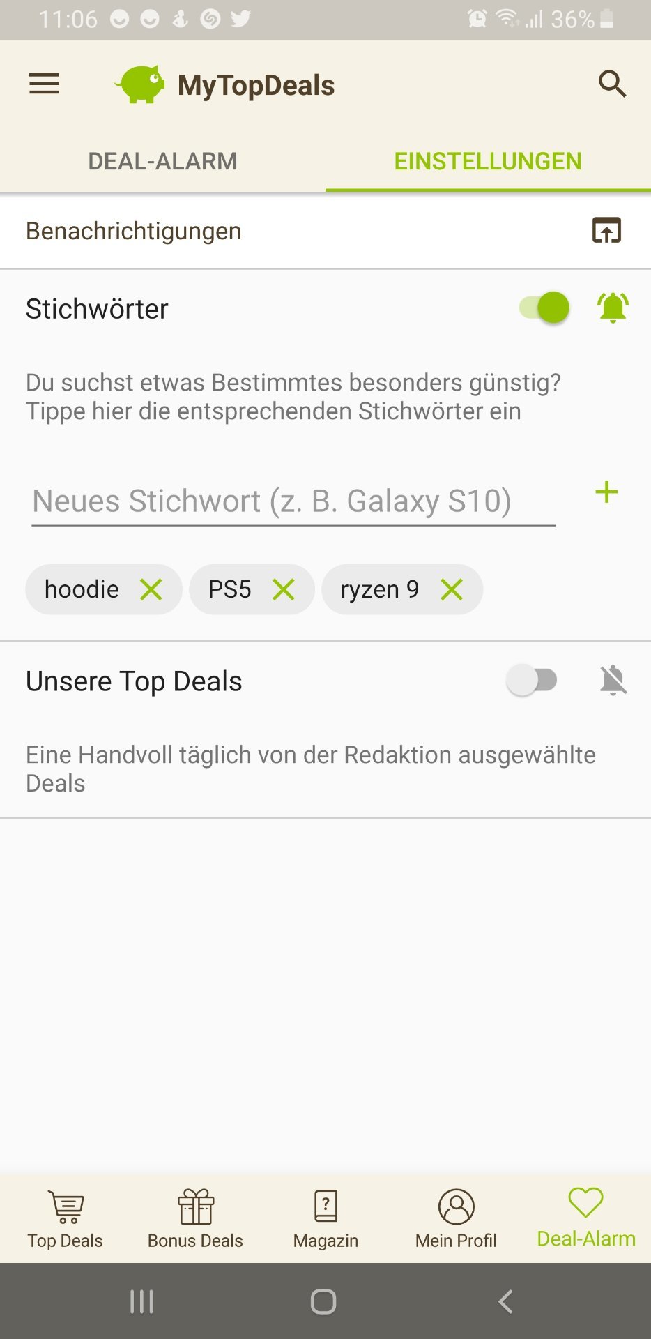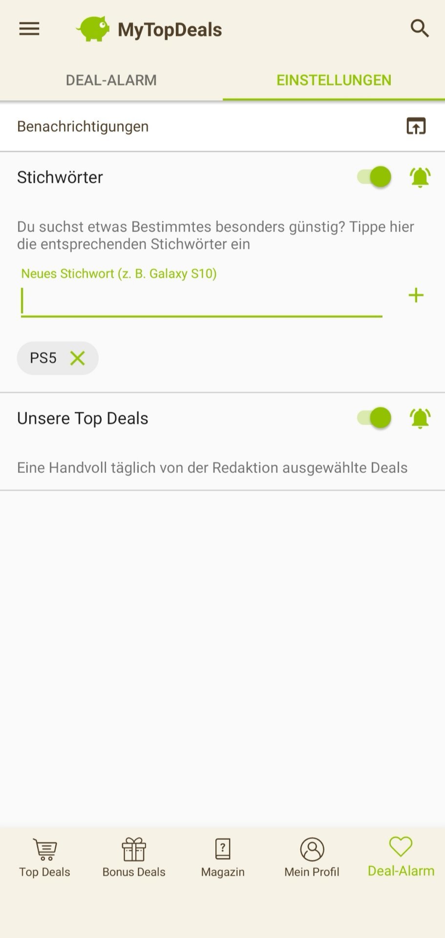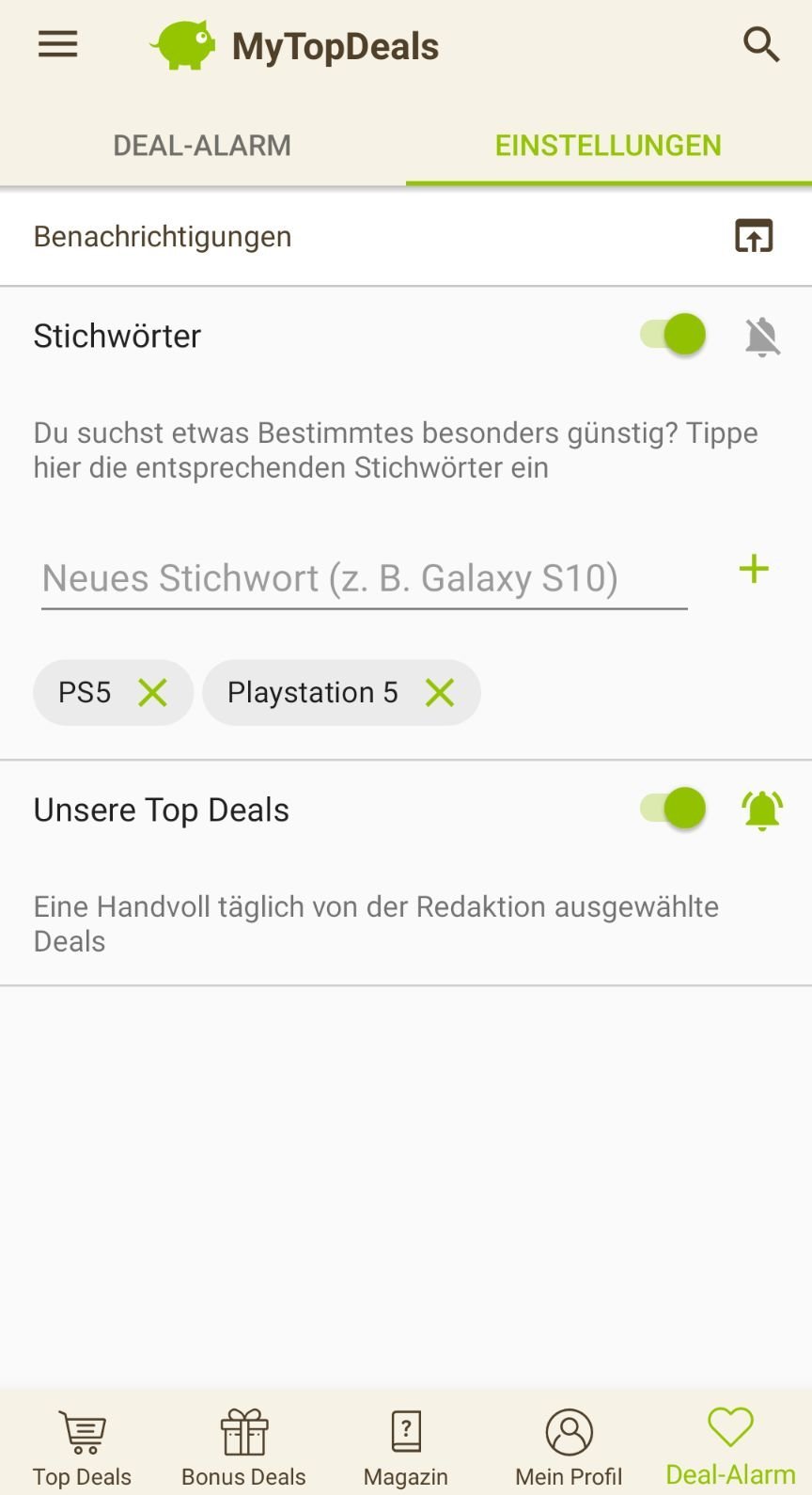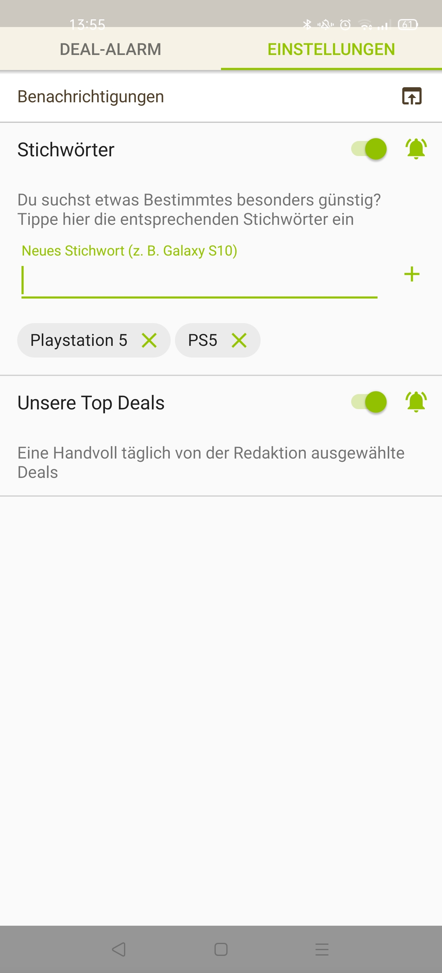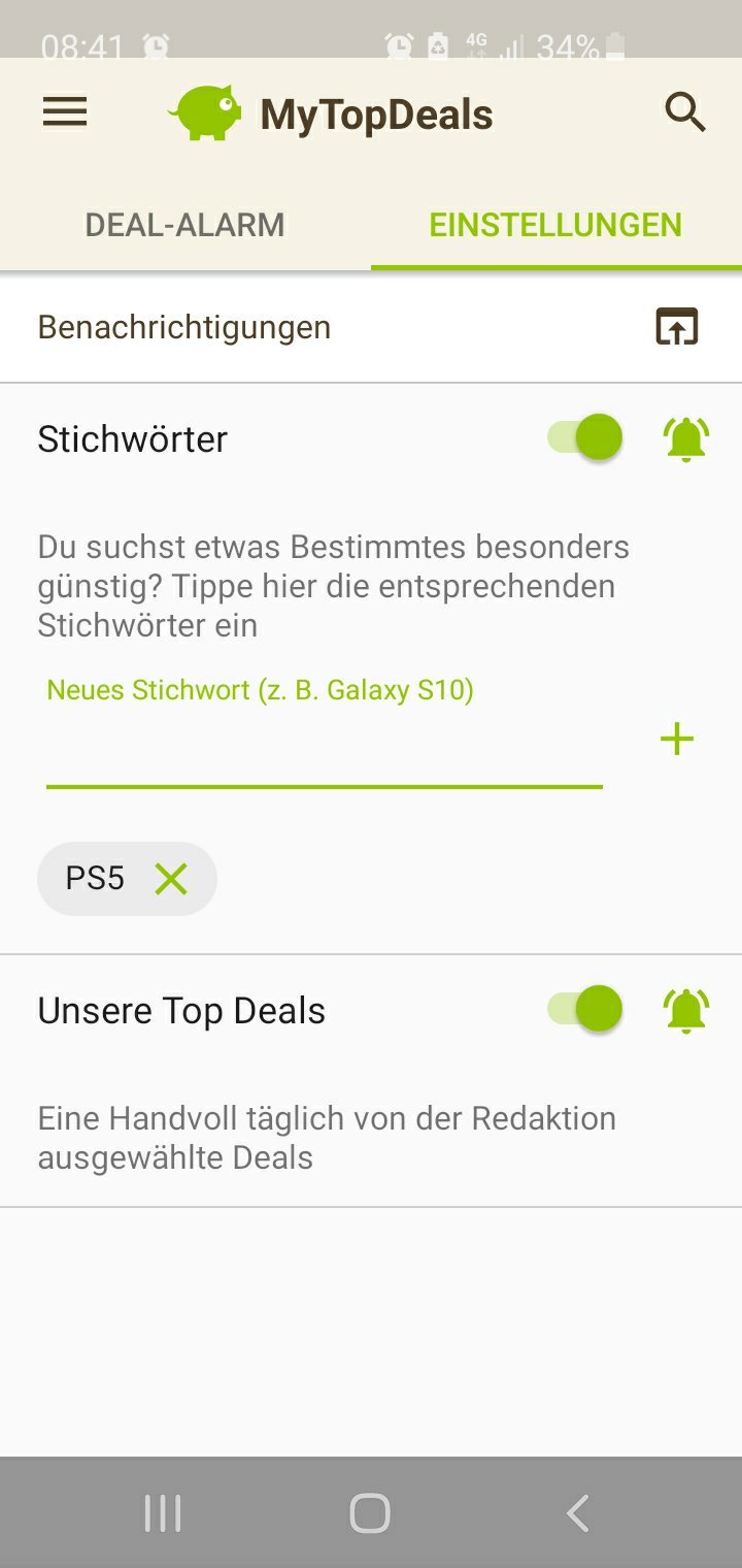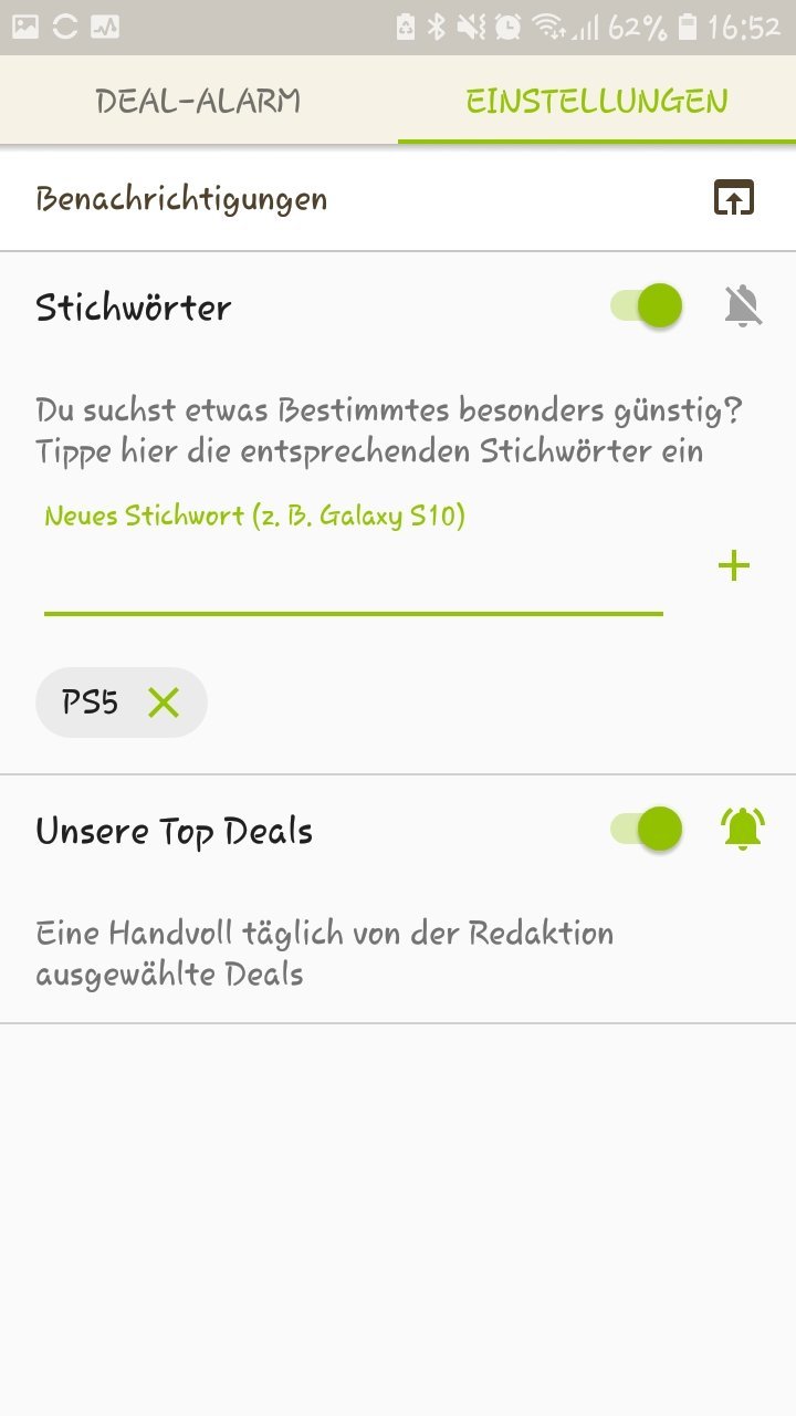 • Android: Deal-Alarm (rechts unten) > Einstellungen > > Stichwort hinzufügen (siehe Screenshot unten)