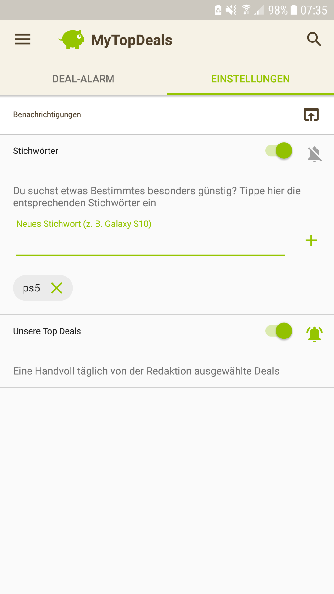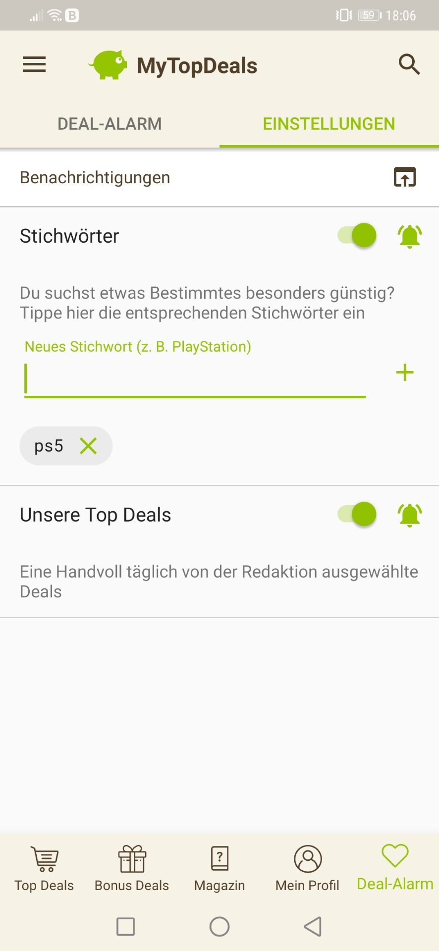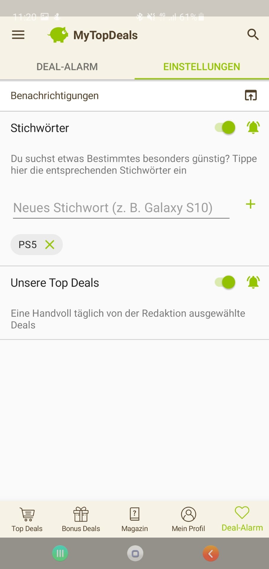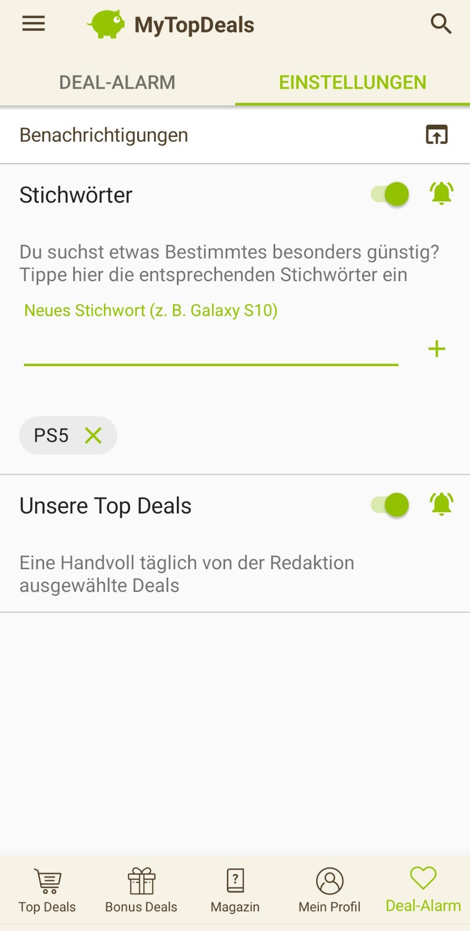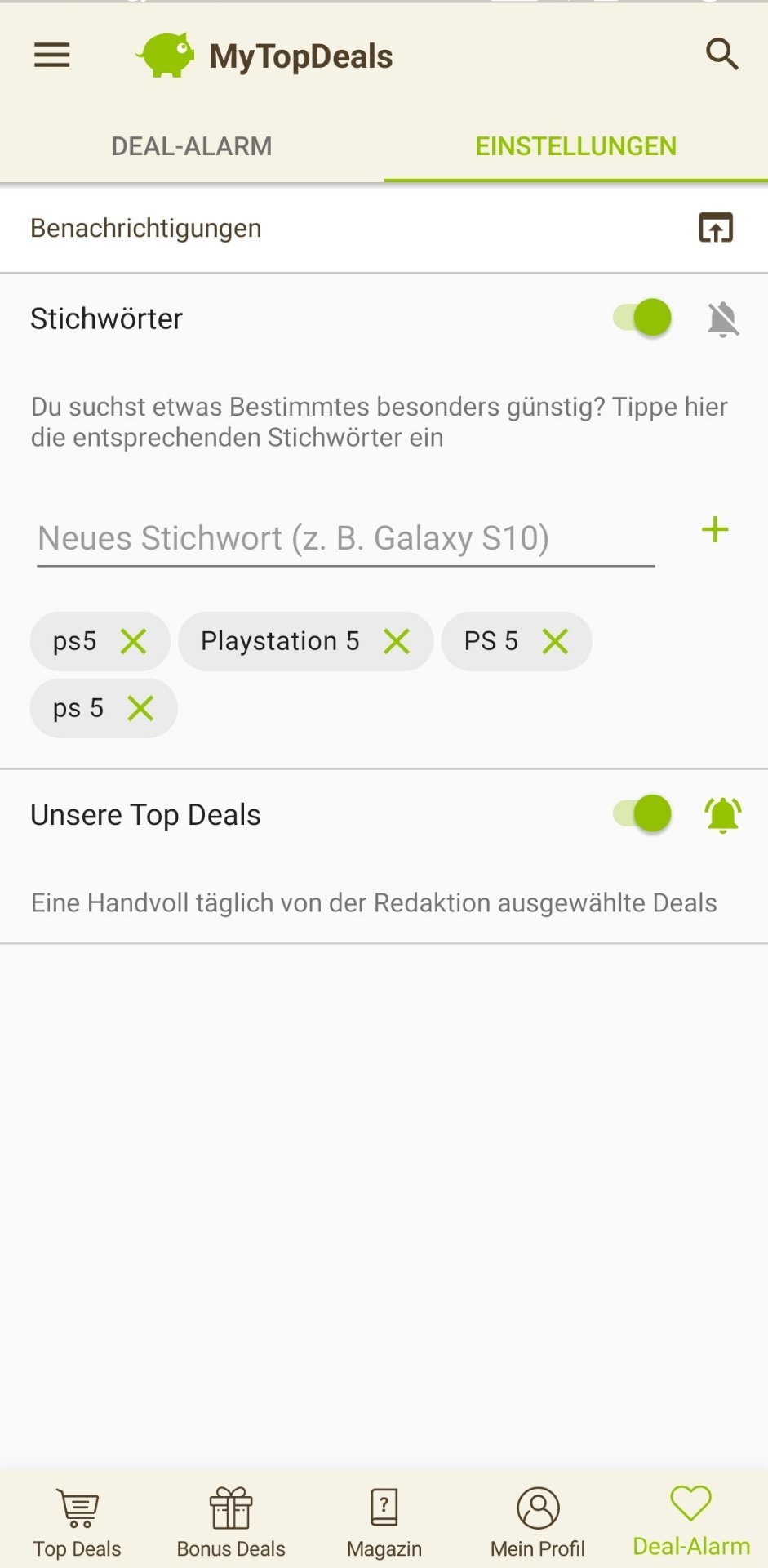 • Android: Deal-Alarm (rechts unten) > Einstellungen > > Stichwort hinzufügen (siehe Screenshot unten)
