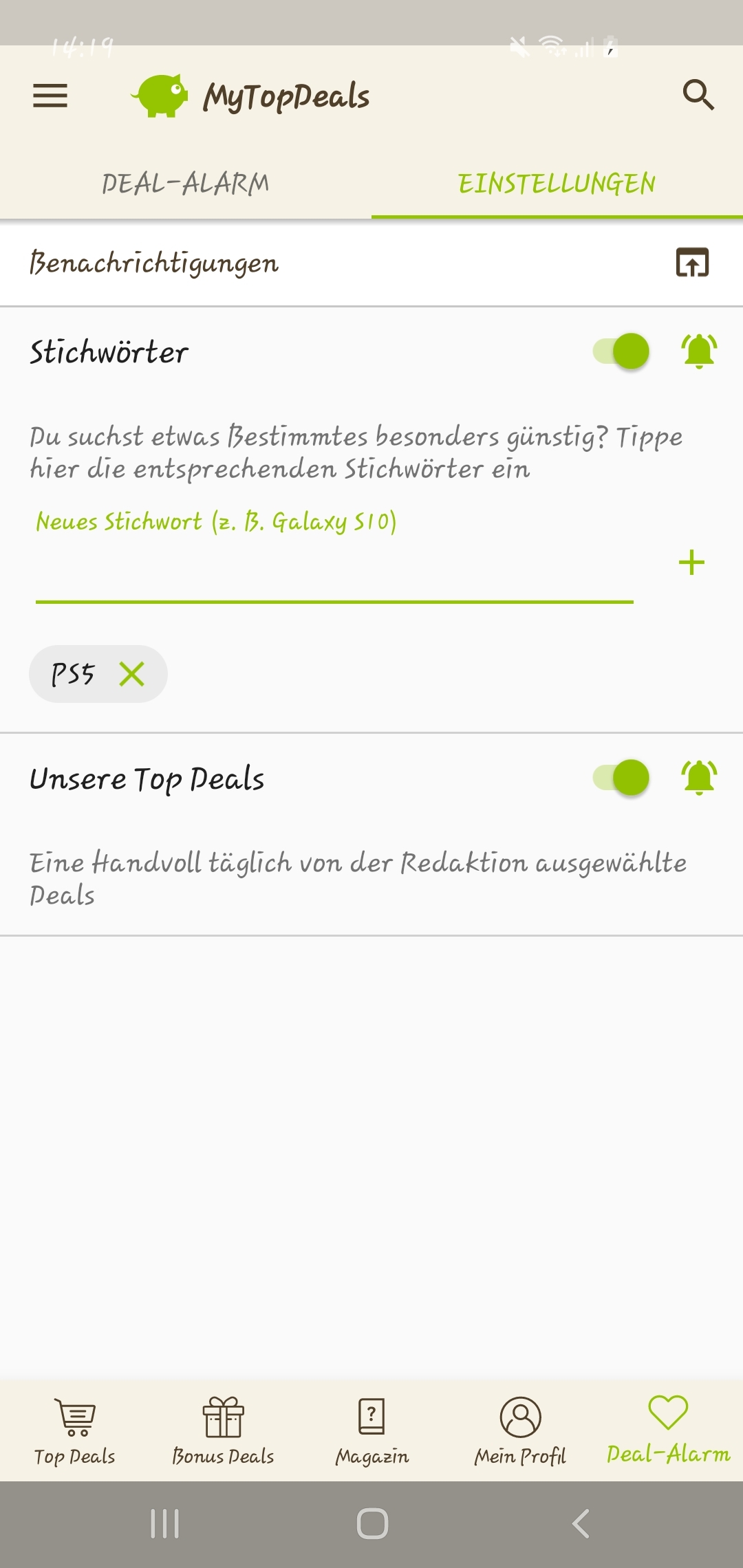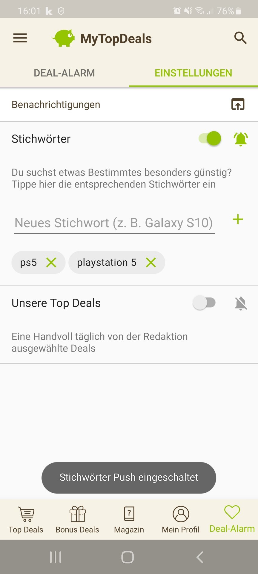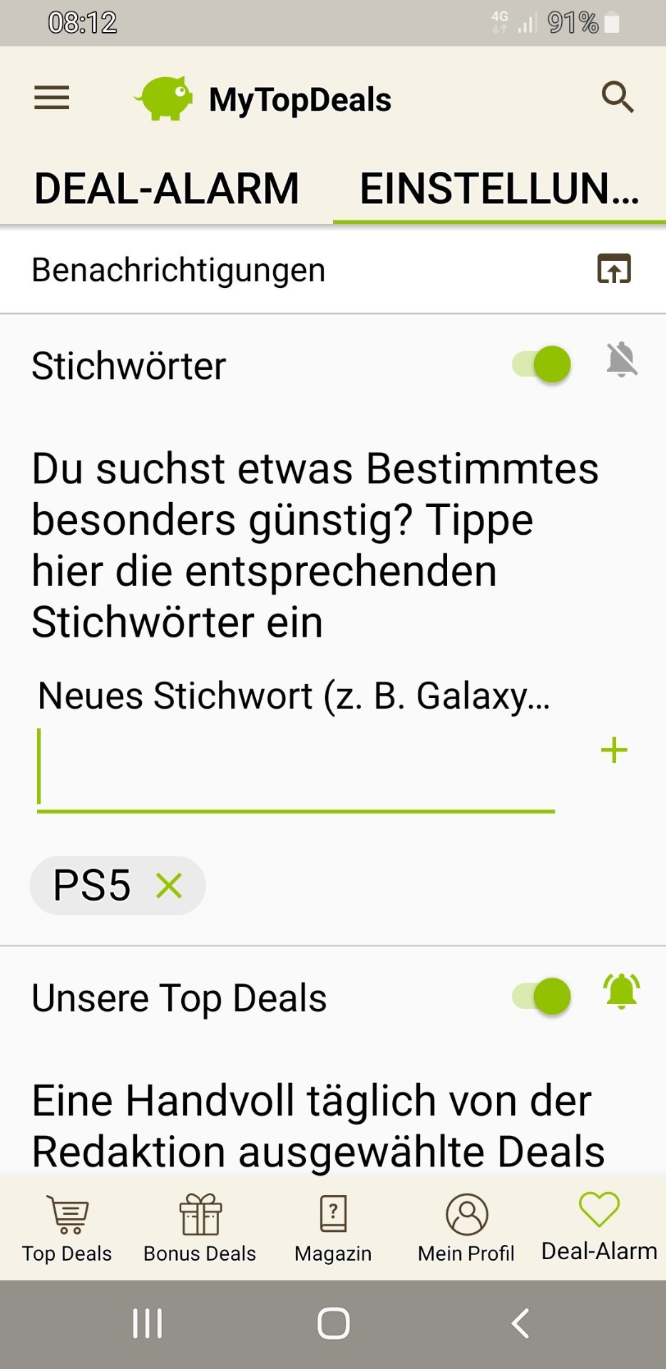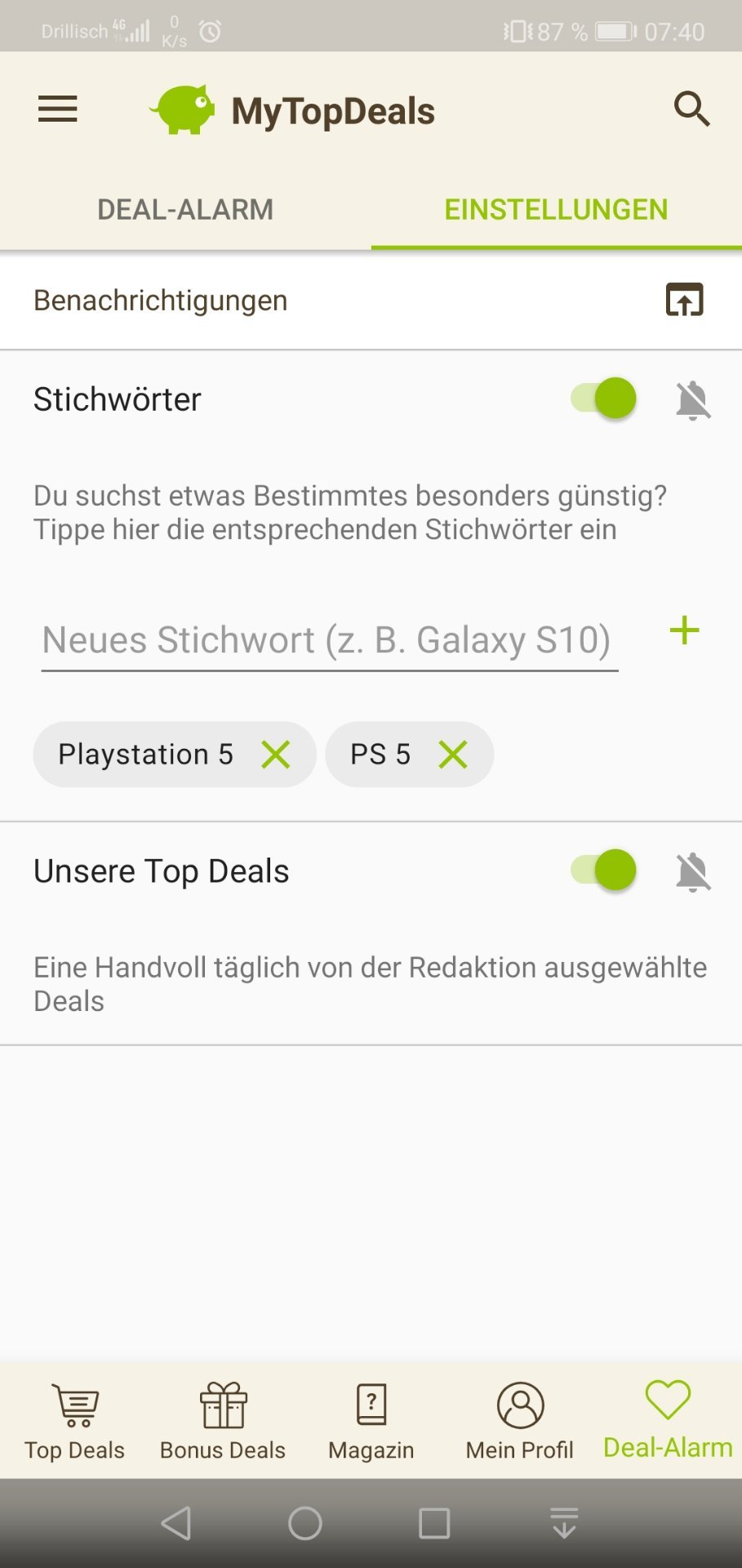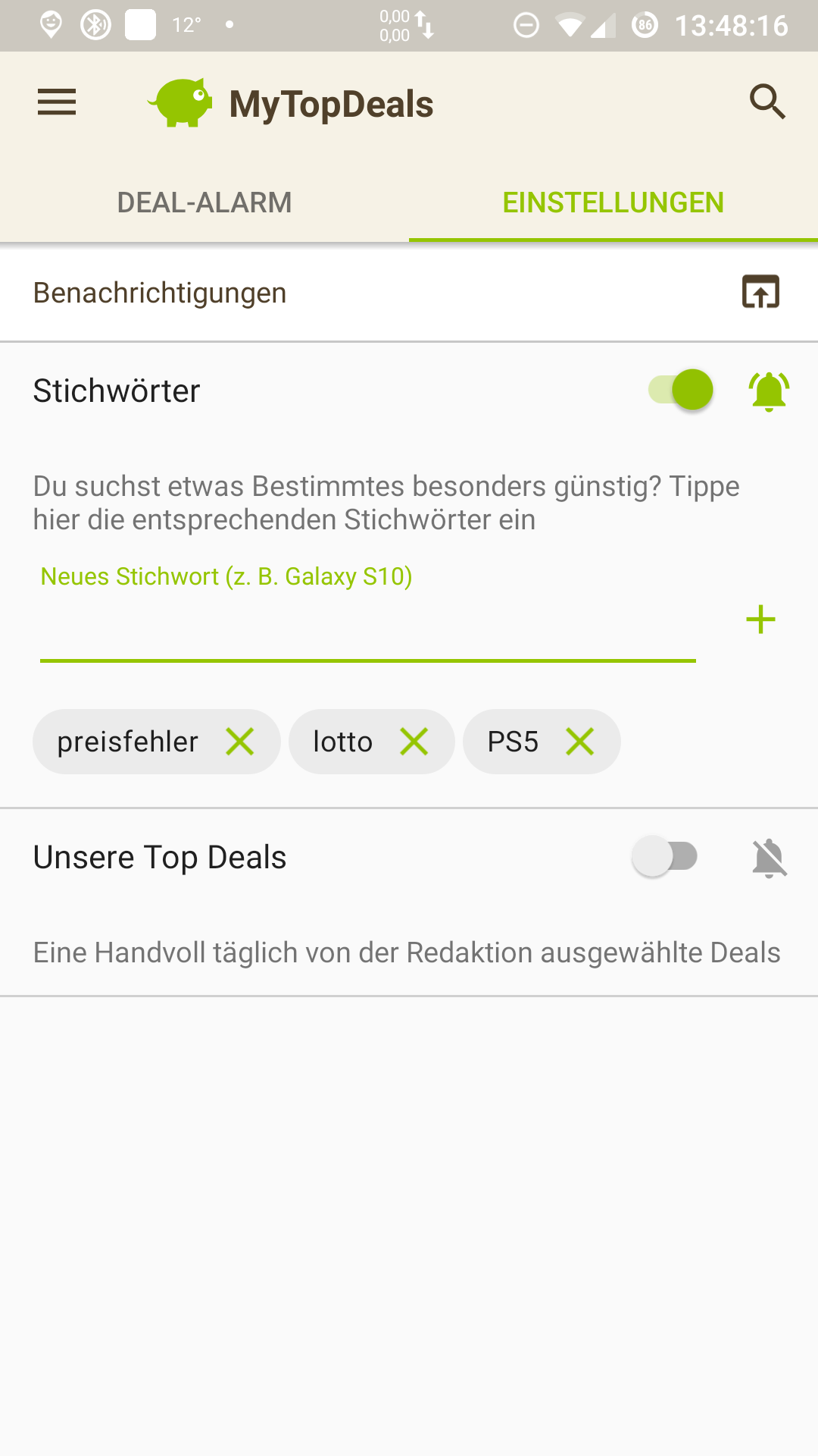 • Android: Deal-Alarm (rechts unten) > Einstellungen > > Stichwort hinzufügen (siehe Screenshot unten)