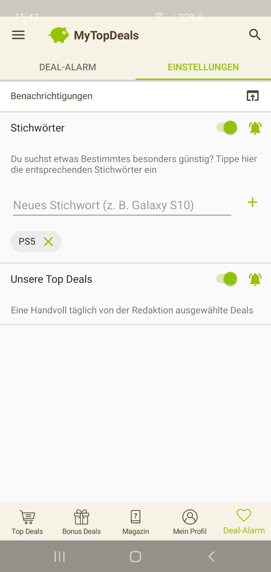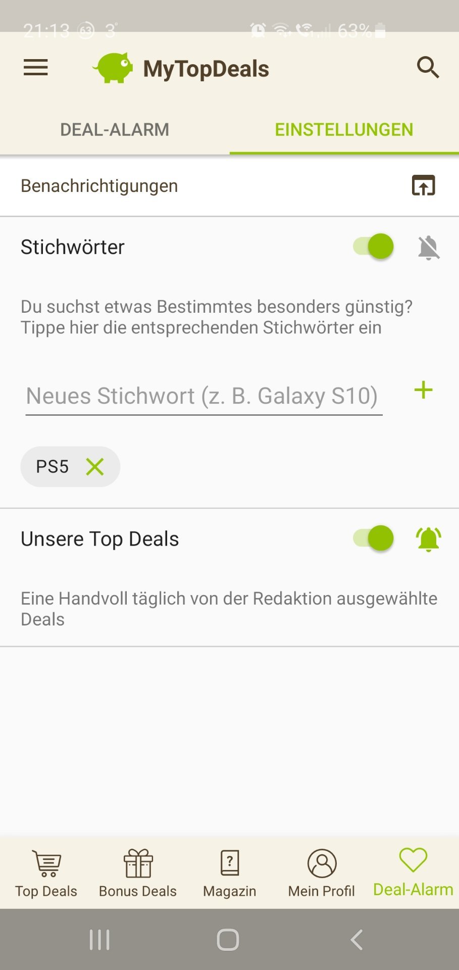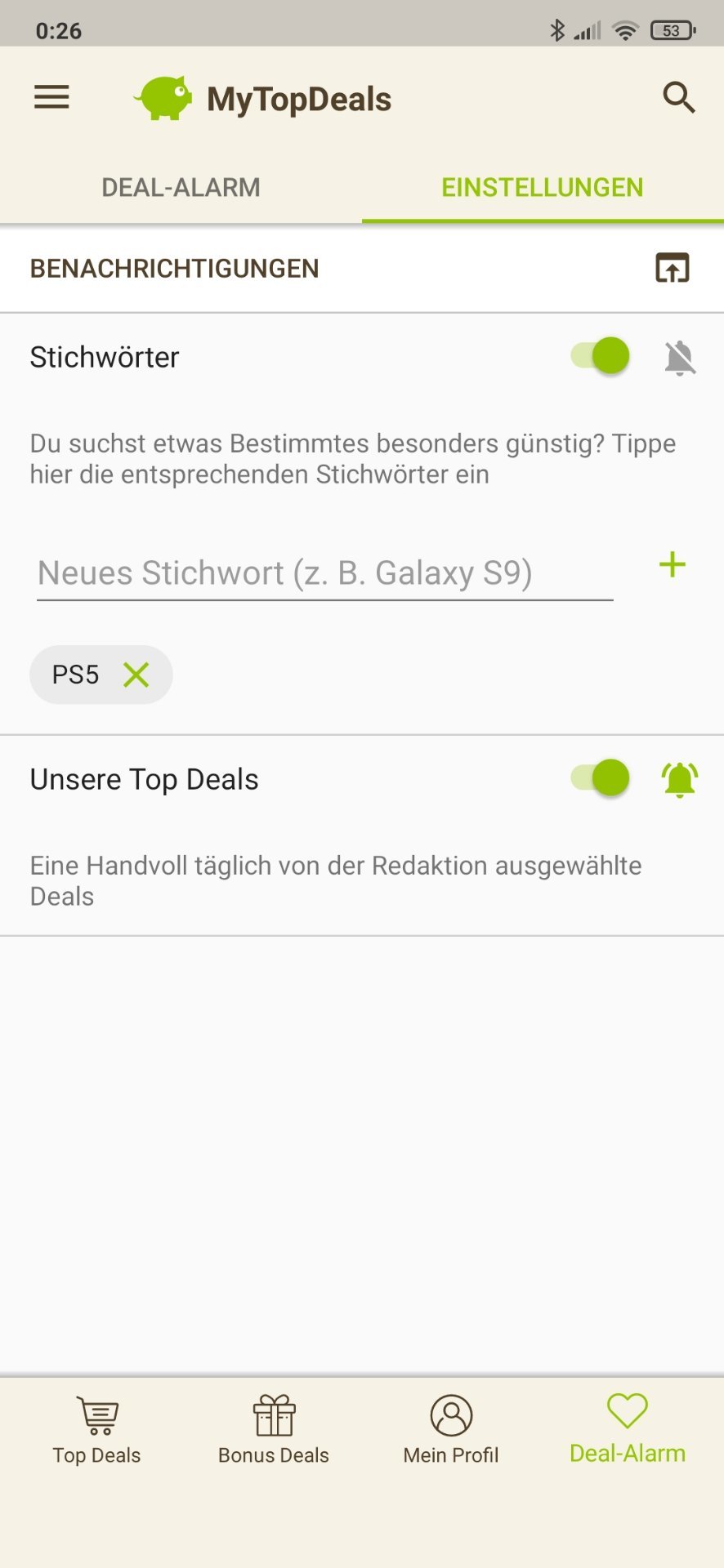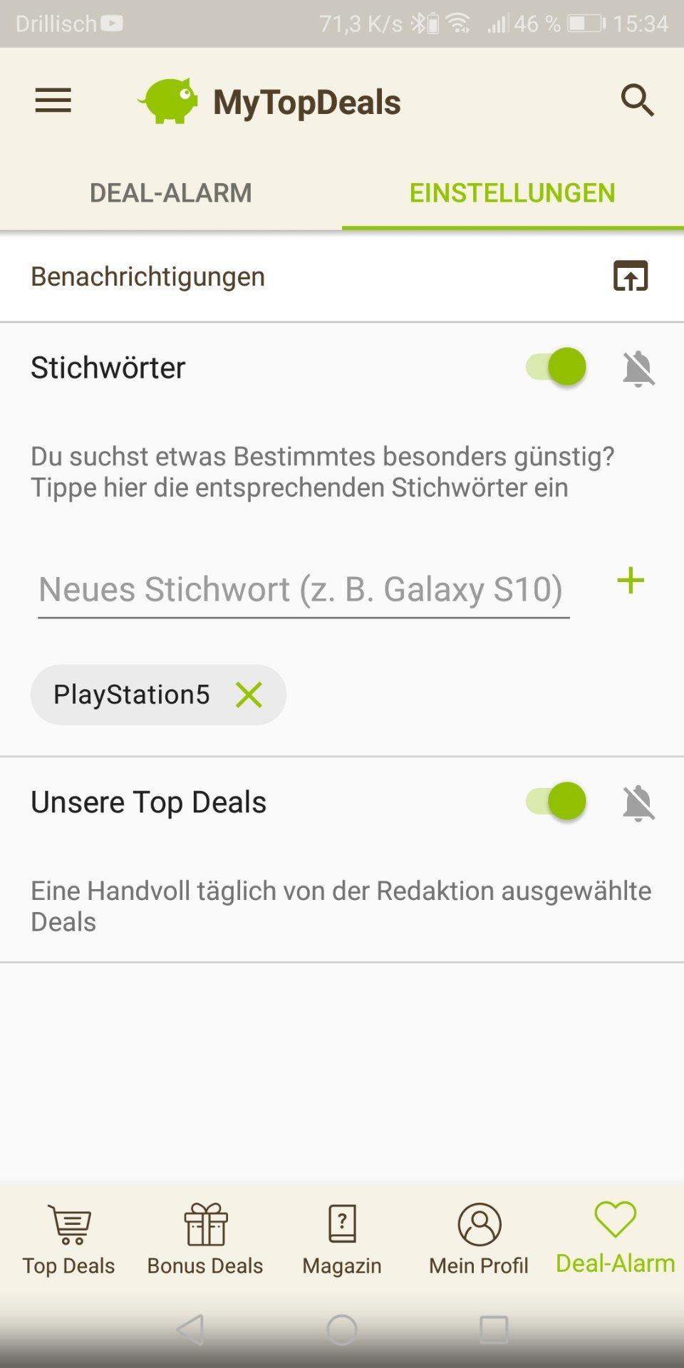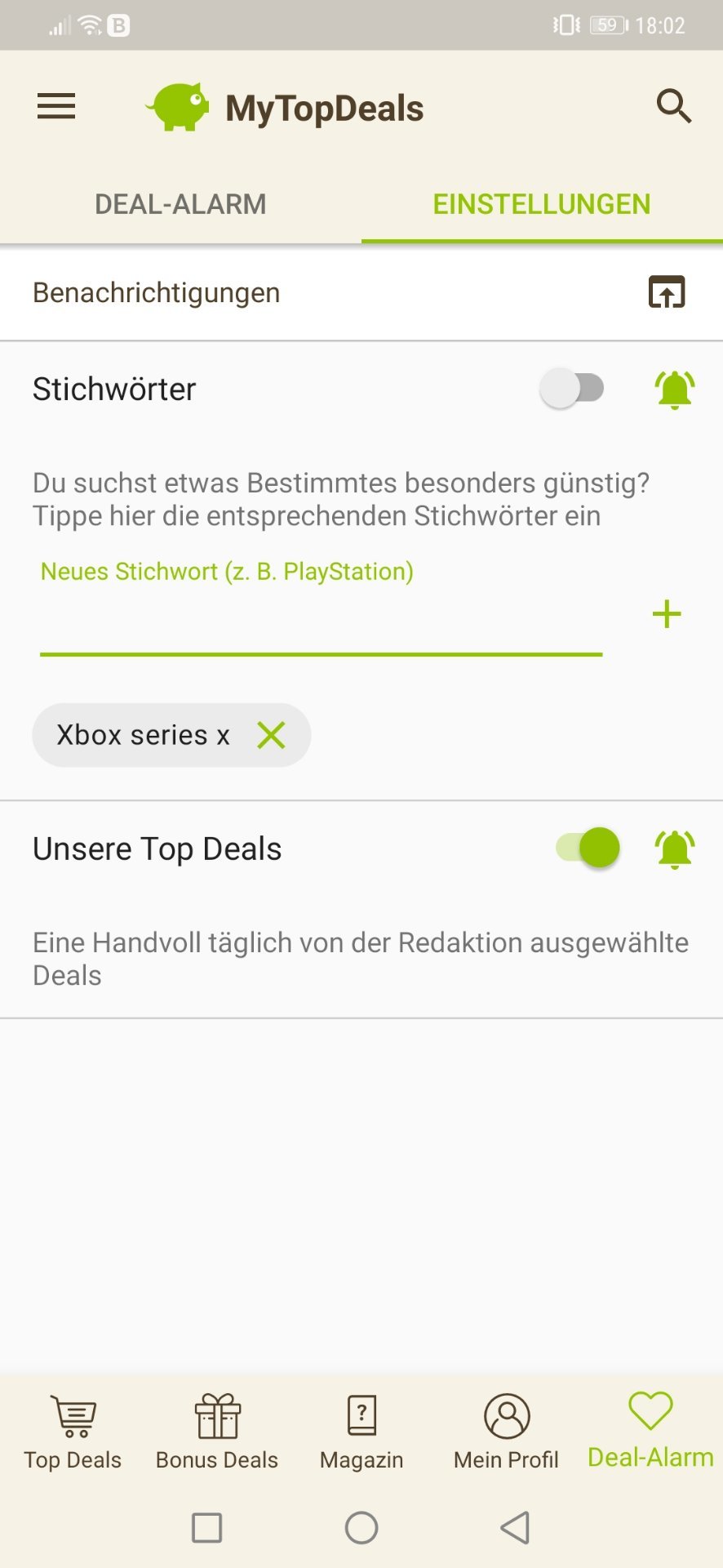• Android: Deal-Alarm (rechts unten) > Einstellungen > > Stichwort hinzufügen (siehe Screenshot unten)