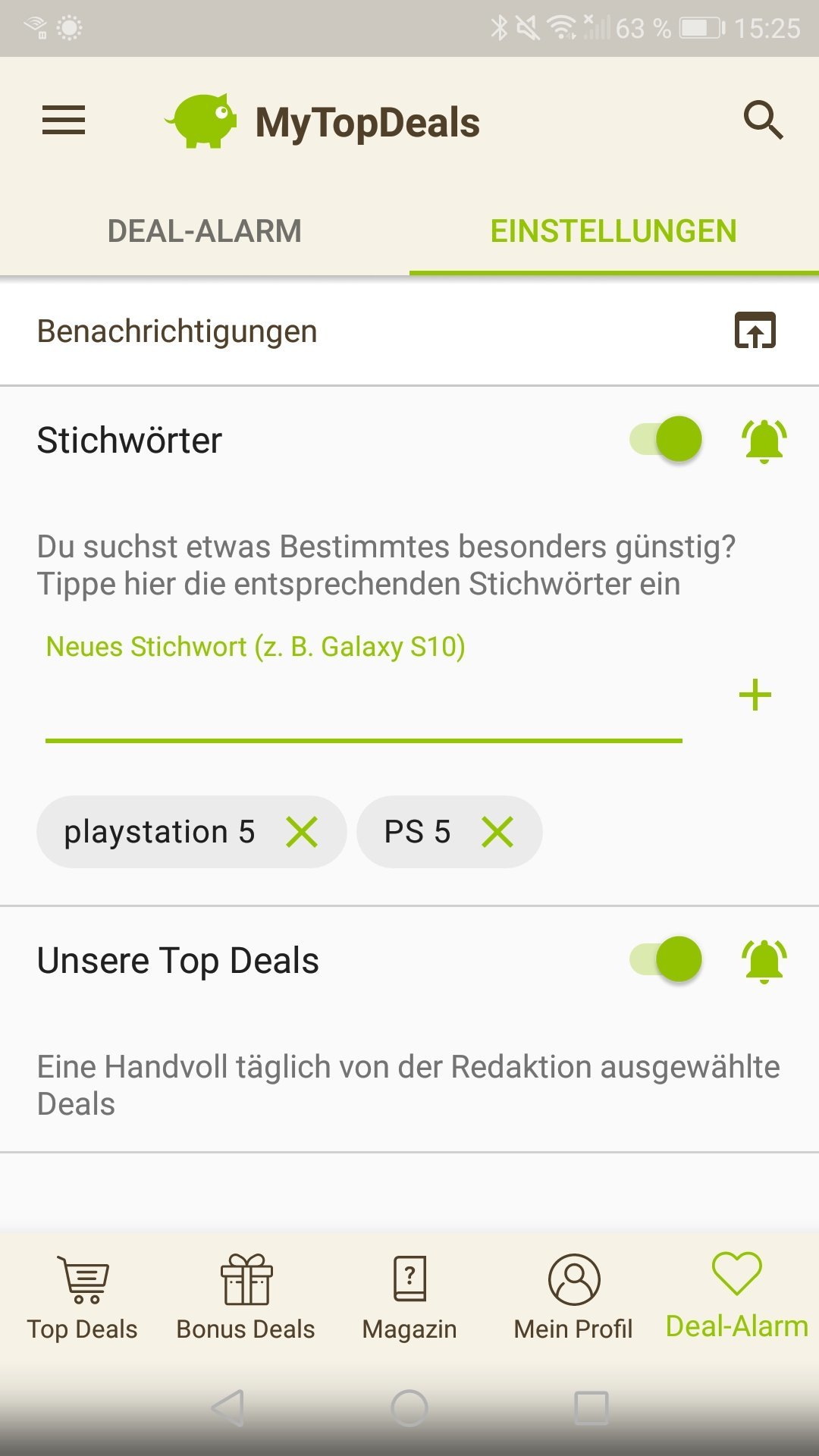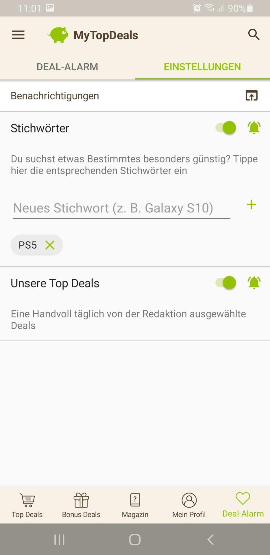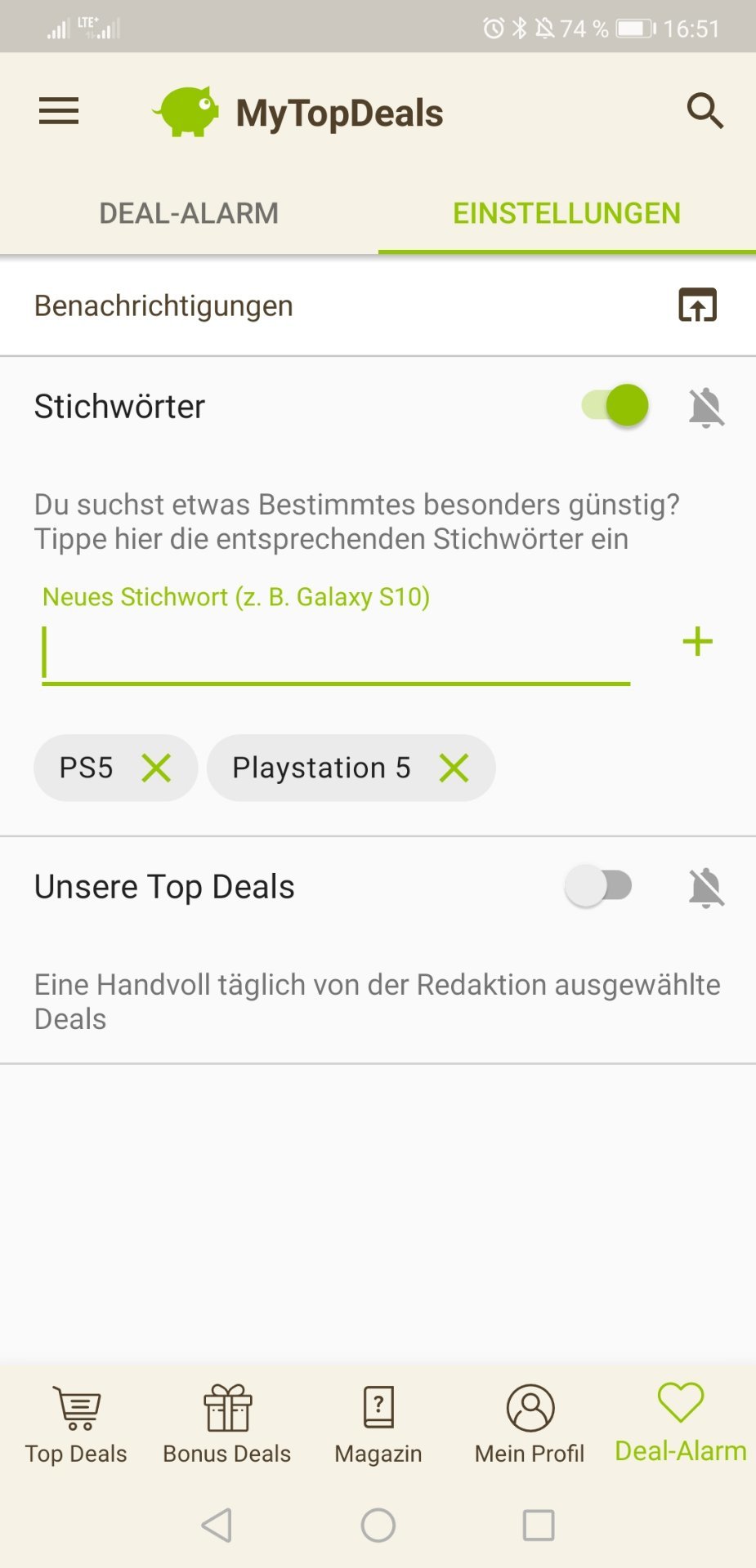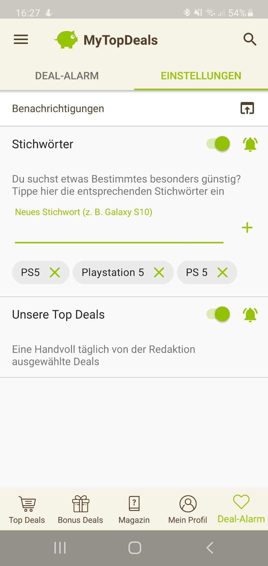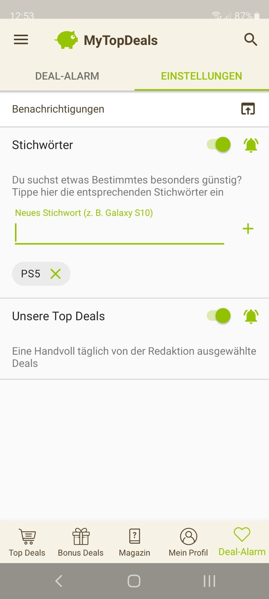 • Android: Deal-Alarm (rechts unten) > Einstellungen > > Stichwort hinzufügen (siehe Screenshot unten)