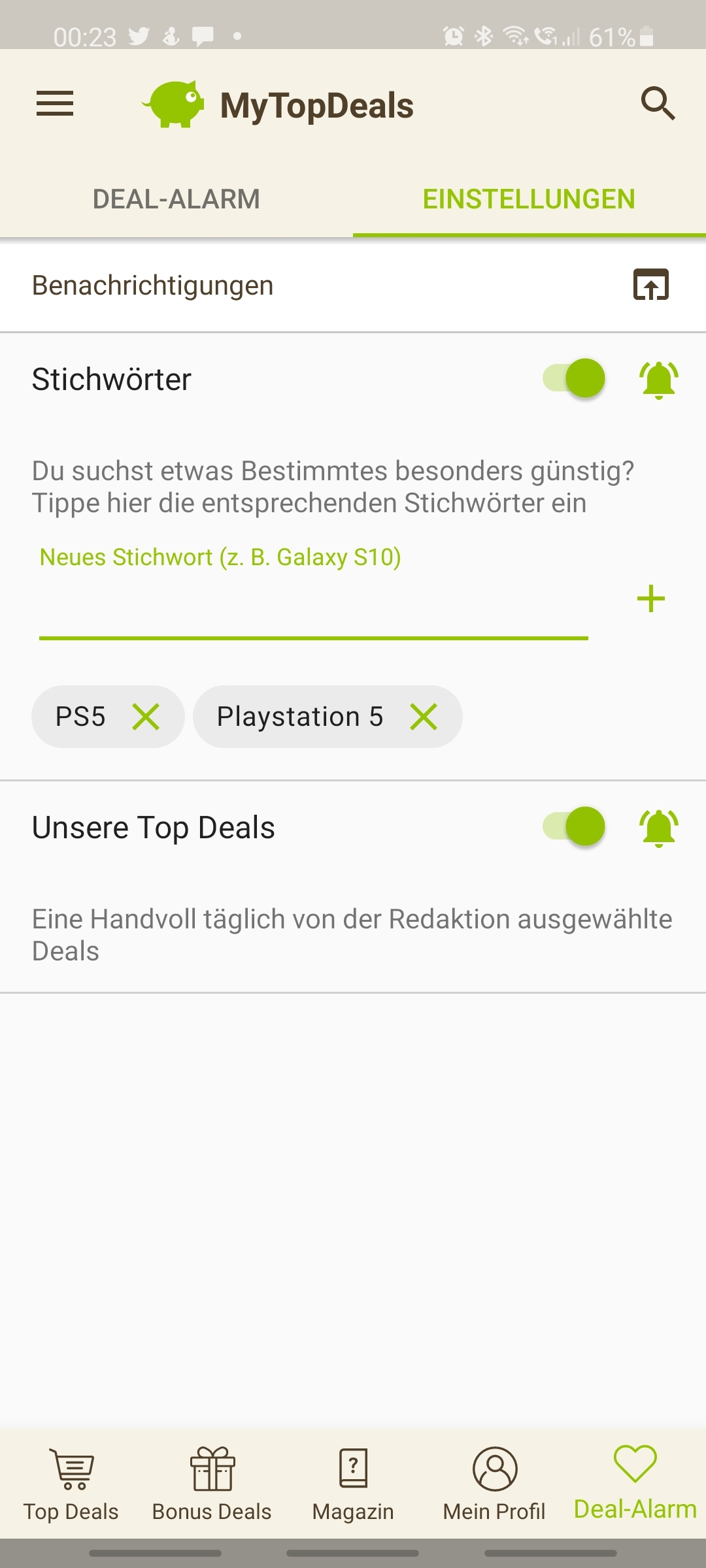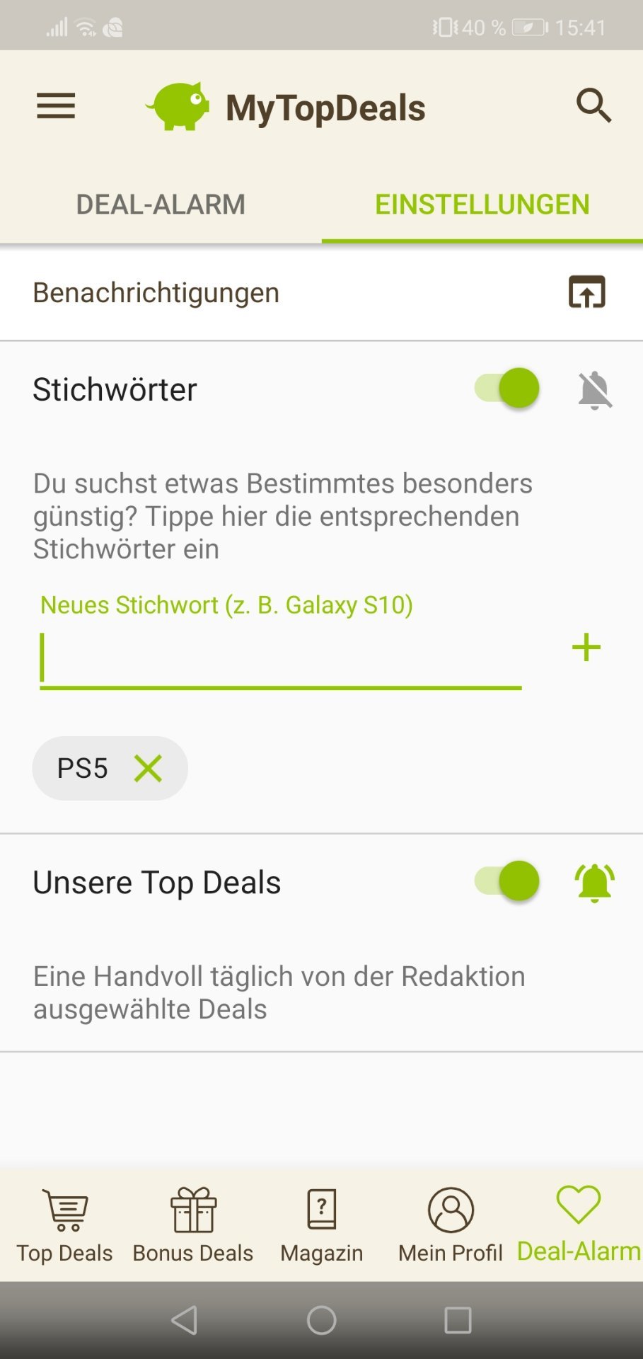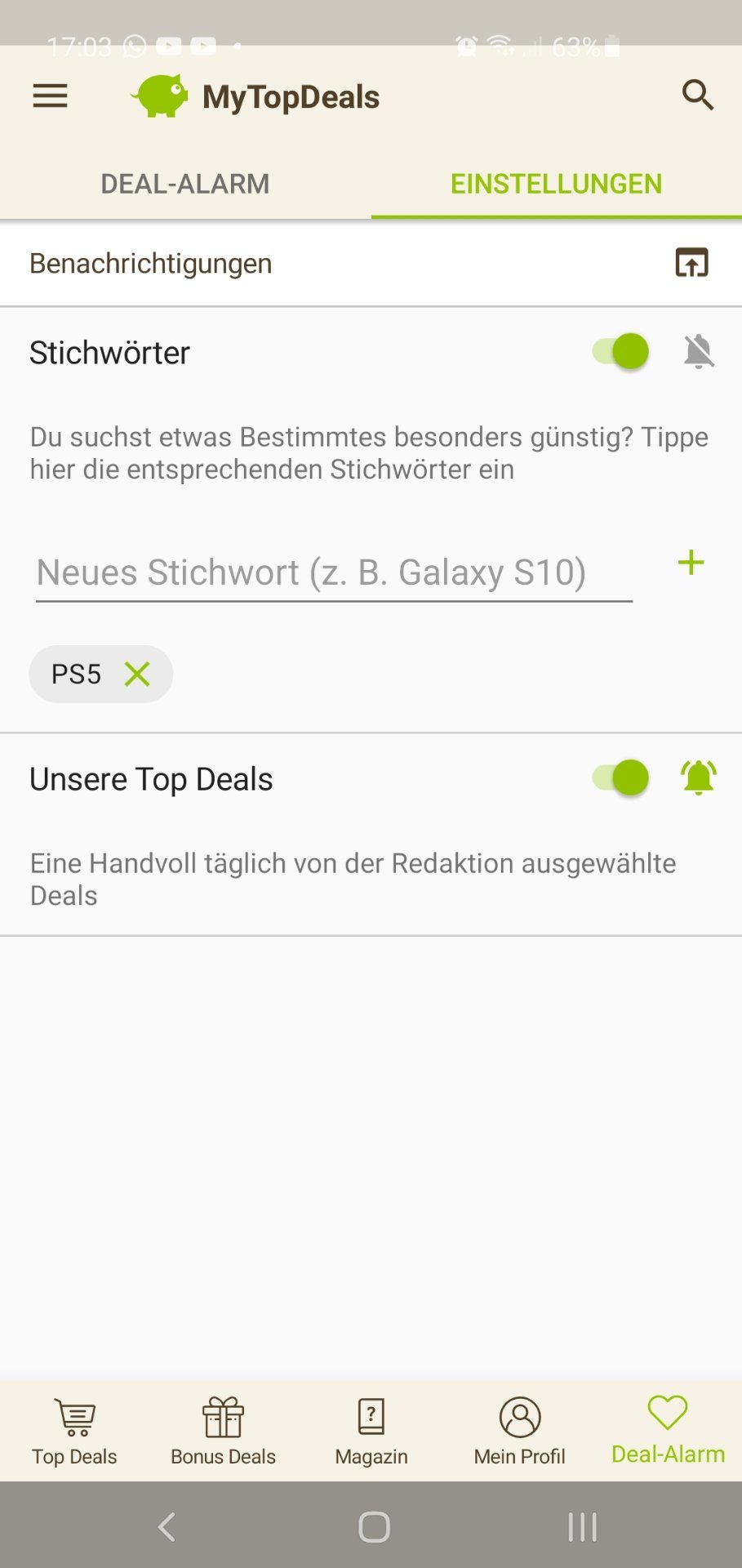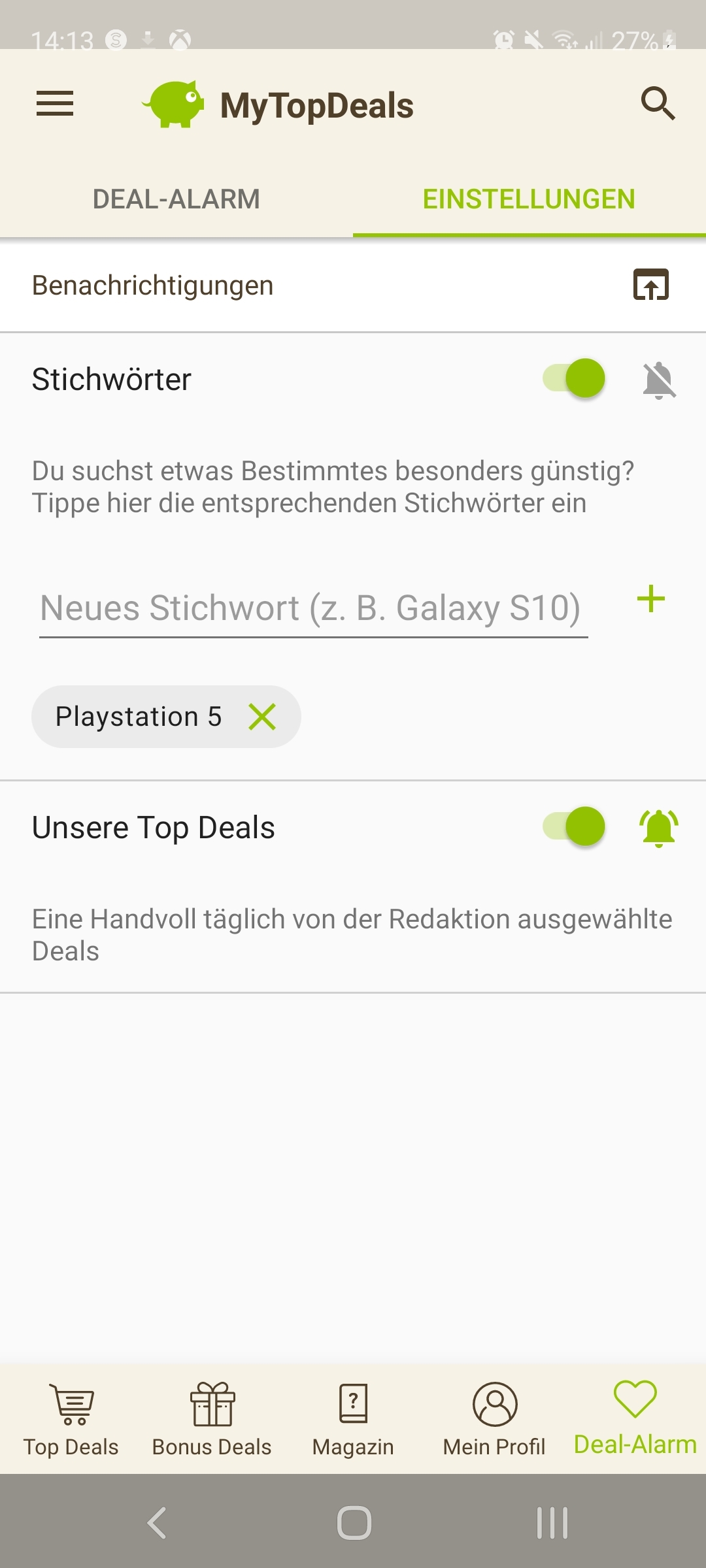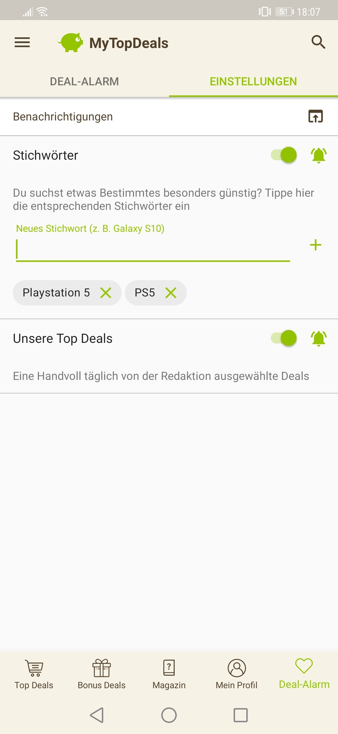 • Android: Deal-Alarm (rechts unten) > Einstellungen > > Stichwort hinzufügen (siehe Screenshot unten)