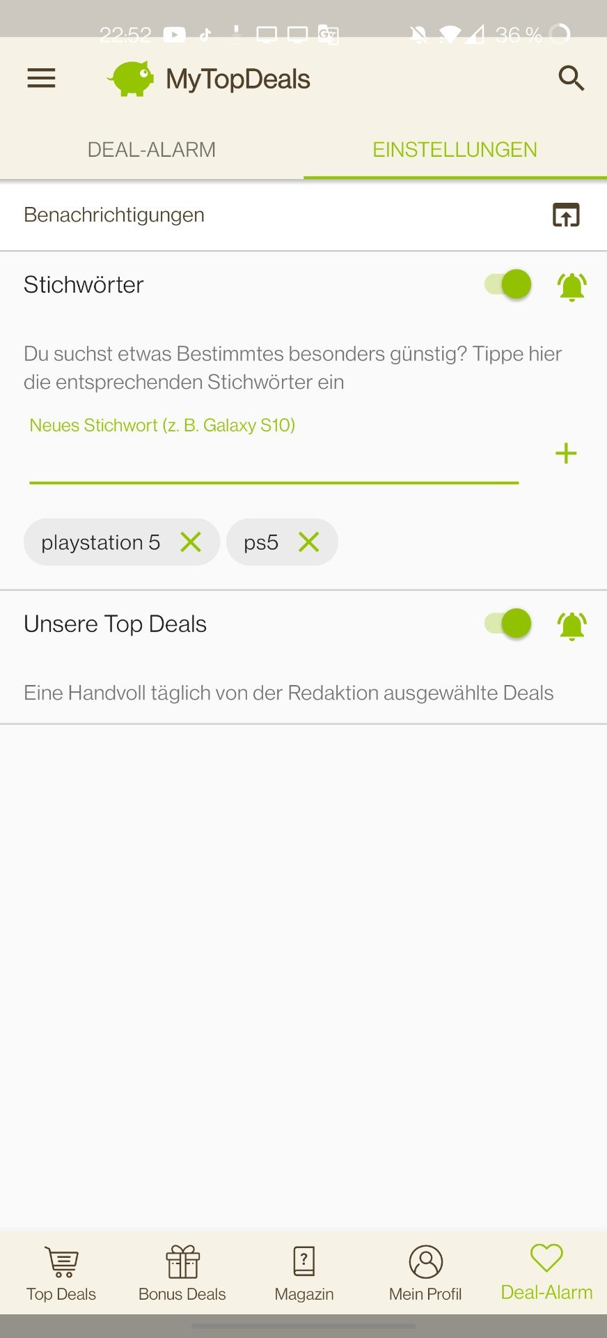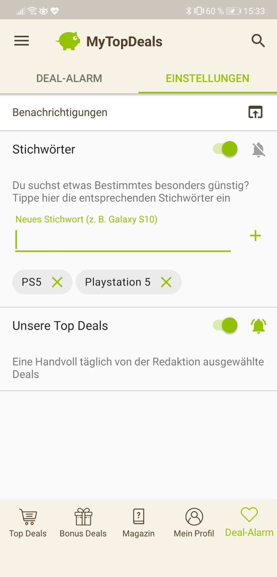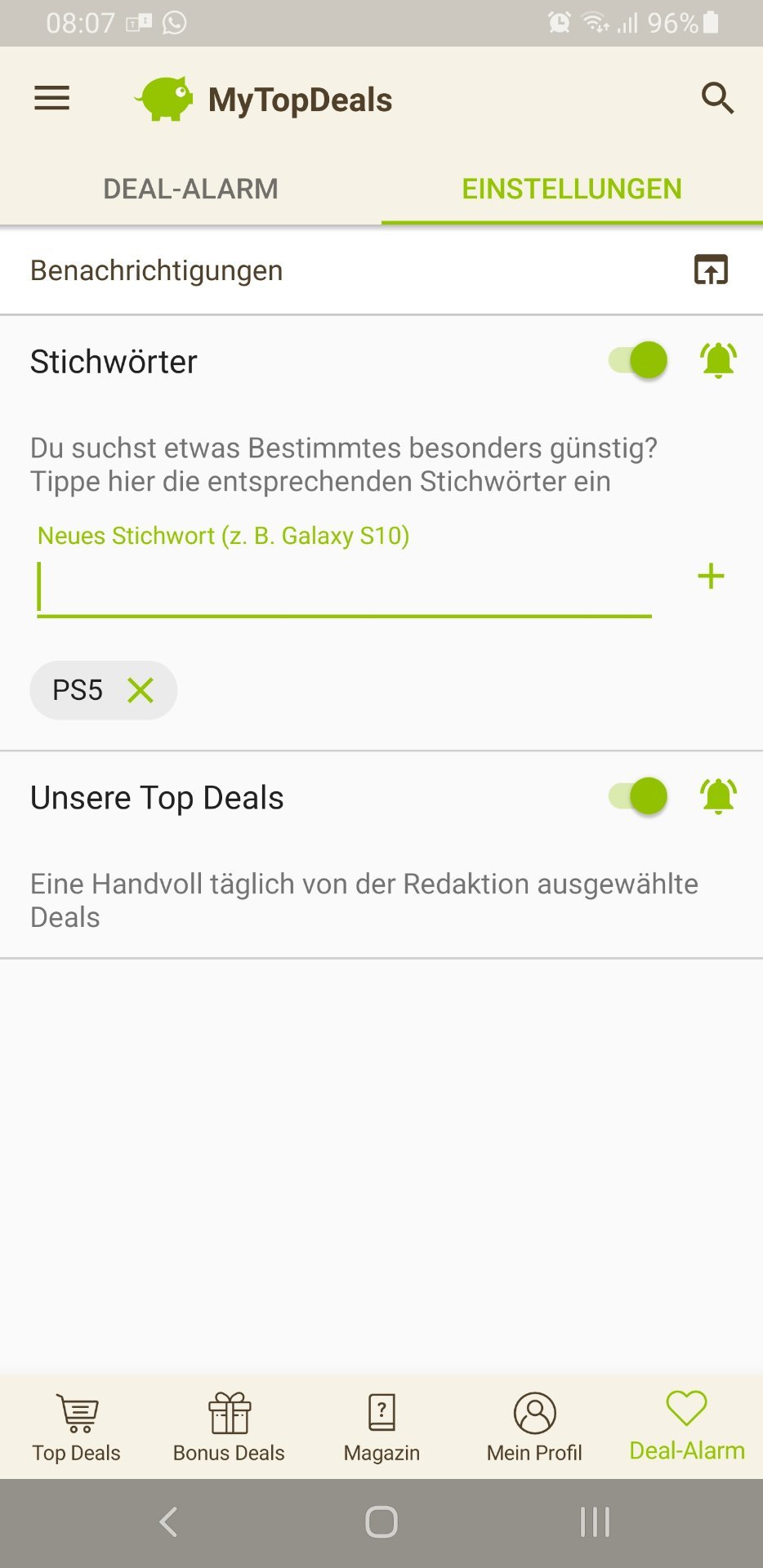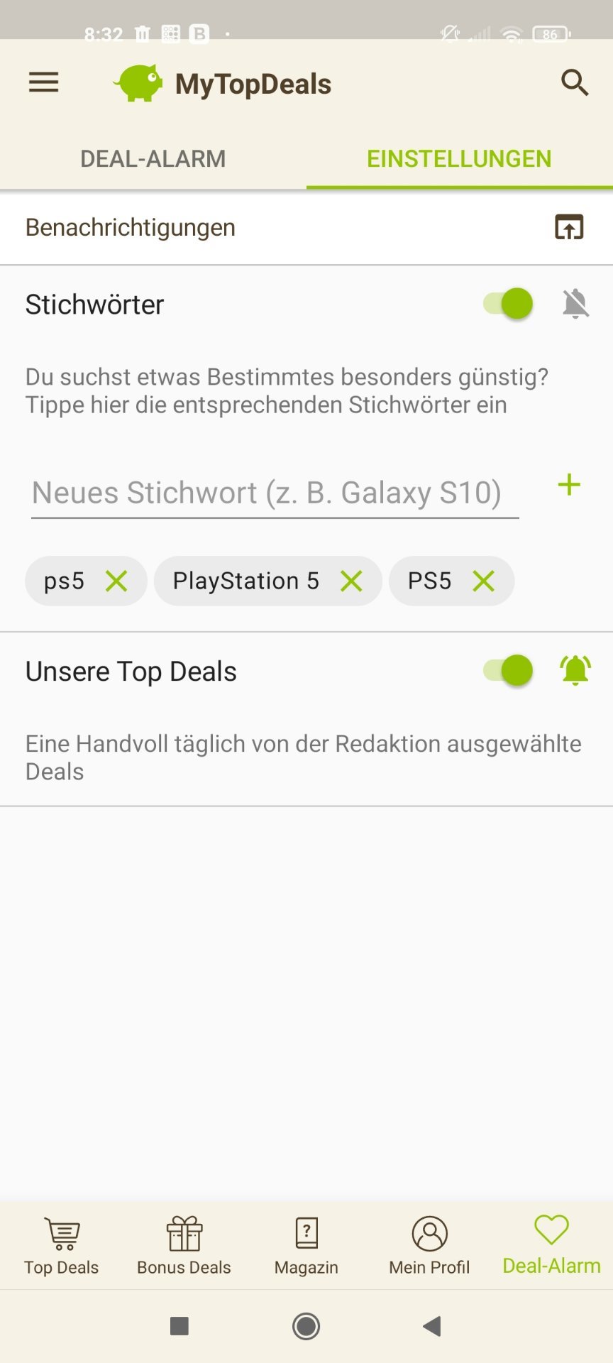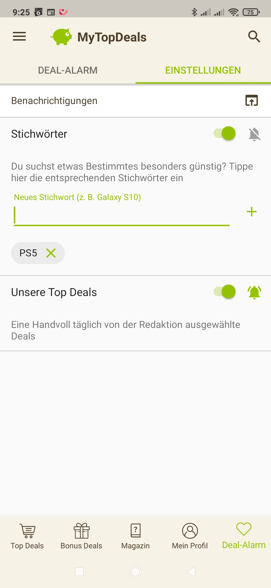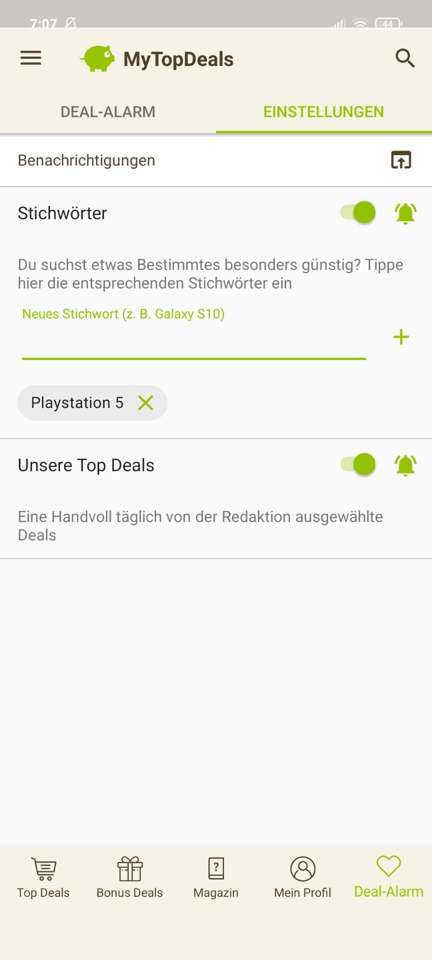 • Android: Deal-Alarm (rechts unten) > Einstellungen > > Stichwort hinzufügen (siehe Screenshot unten)