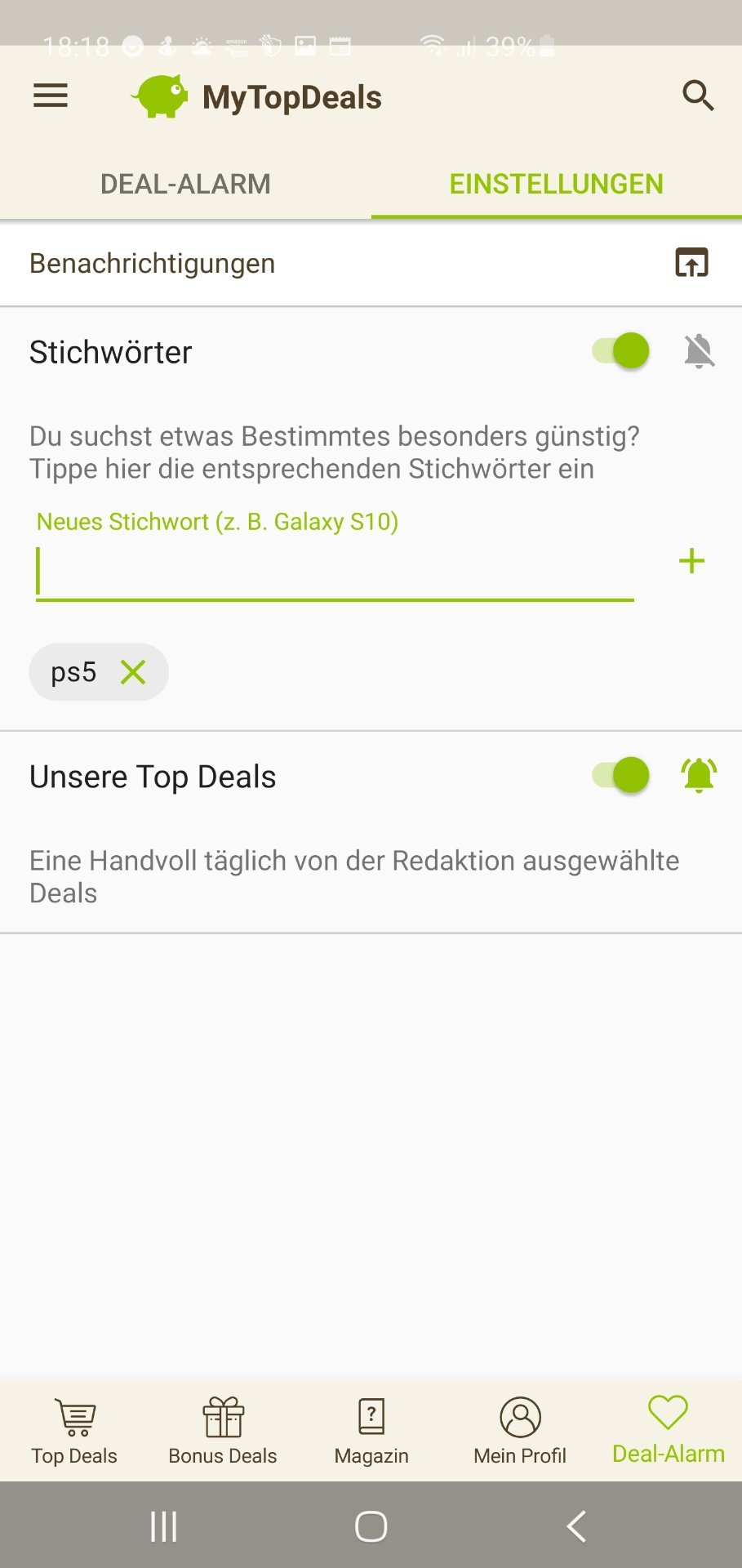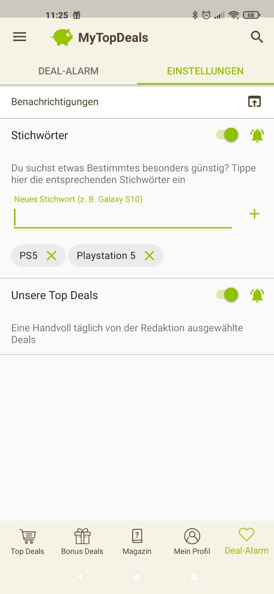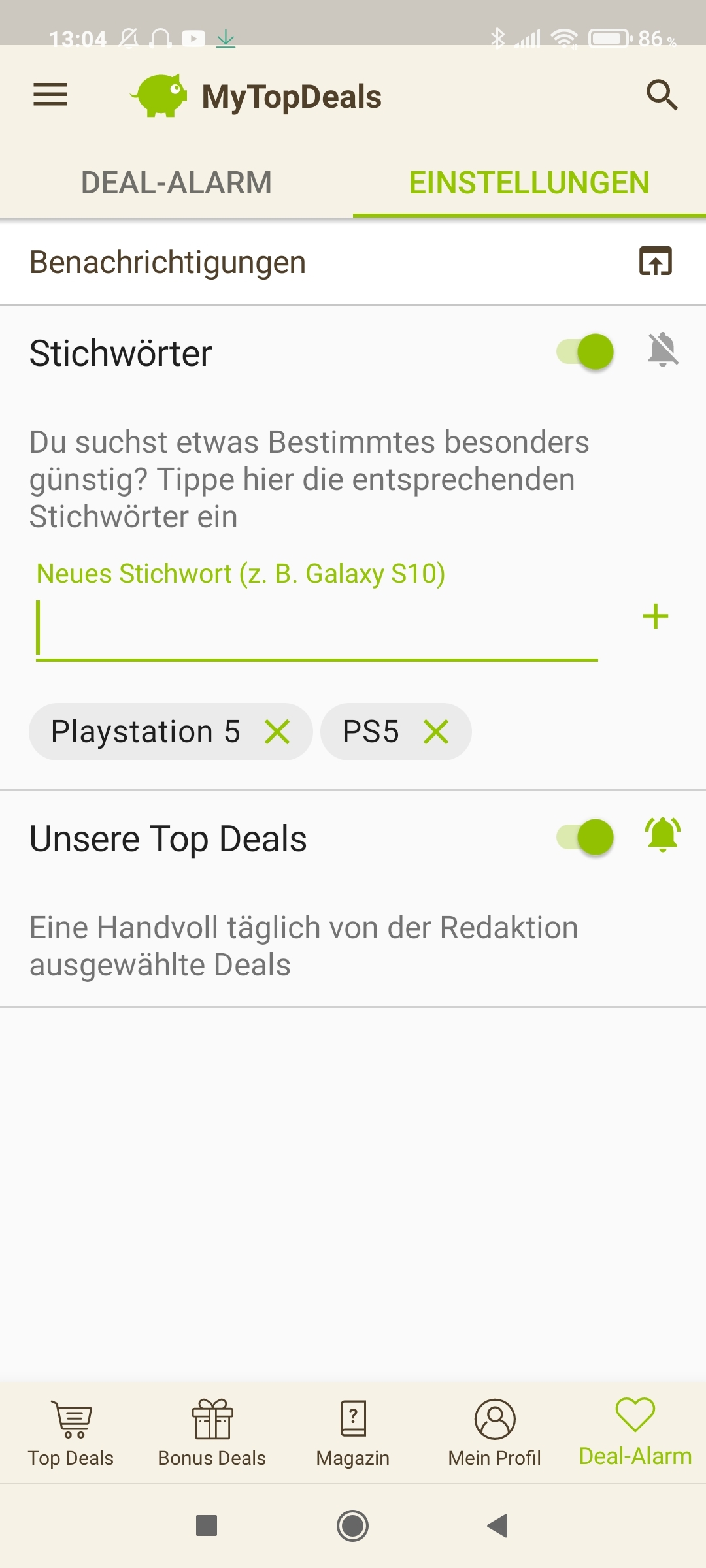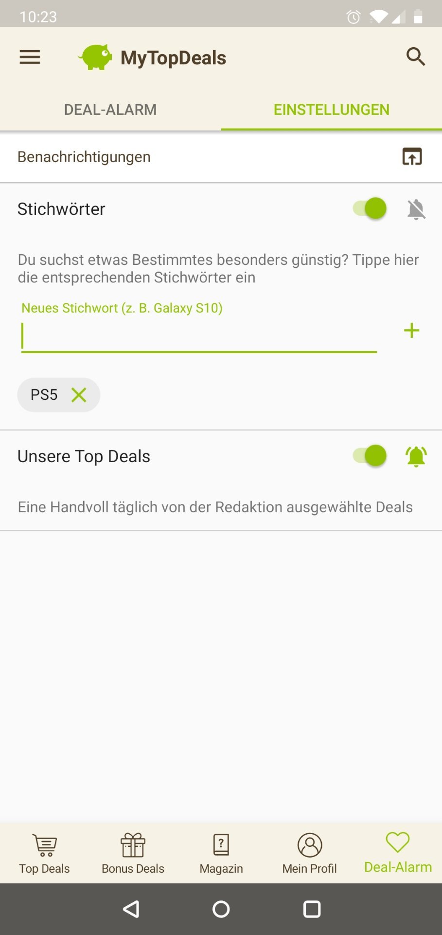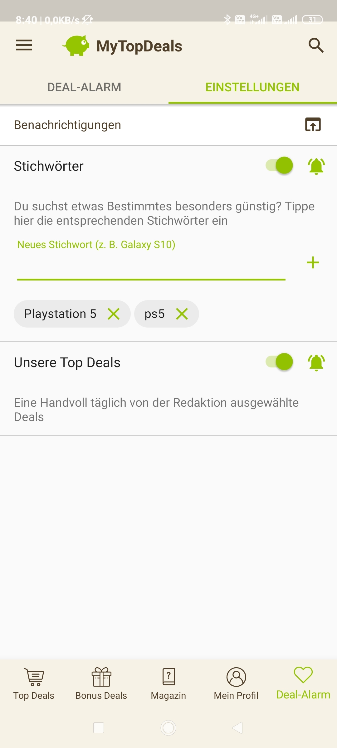 • Android: Deal-Alarm (rechts unten) > Einstellungen > > Stichwort hinzufügen (siehe Screenshot unten)