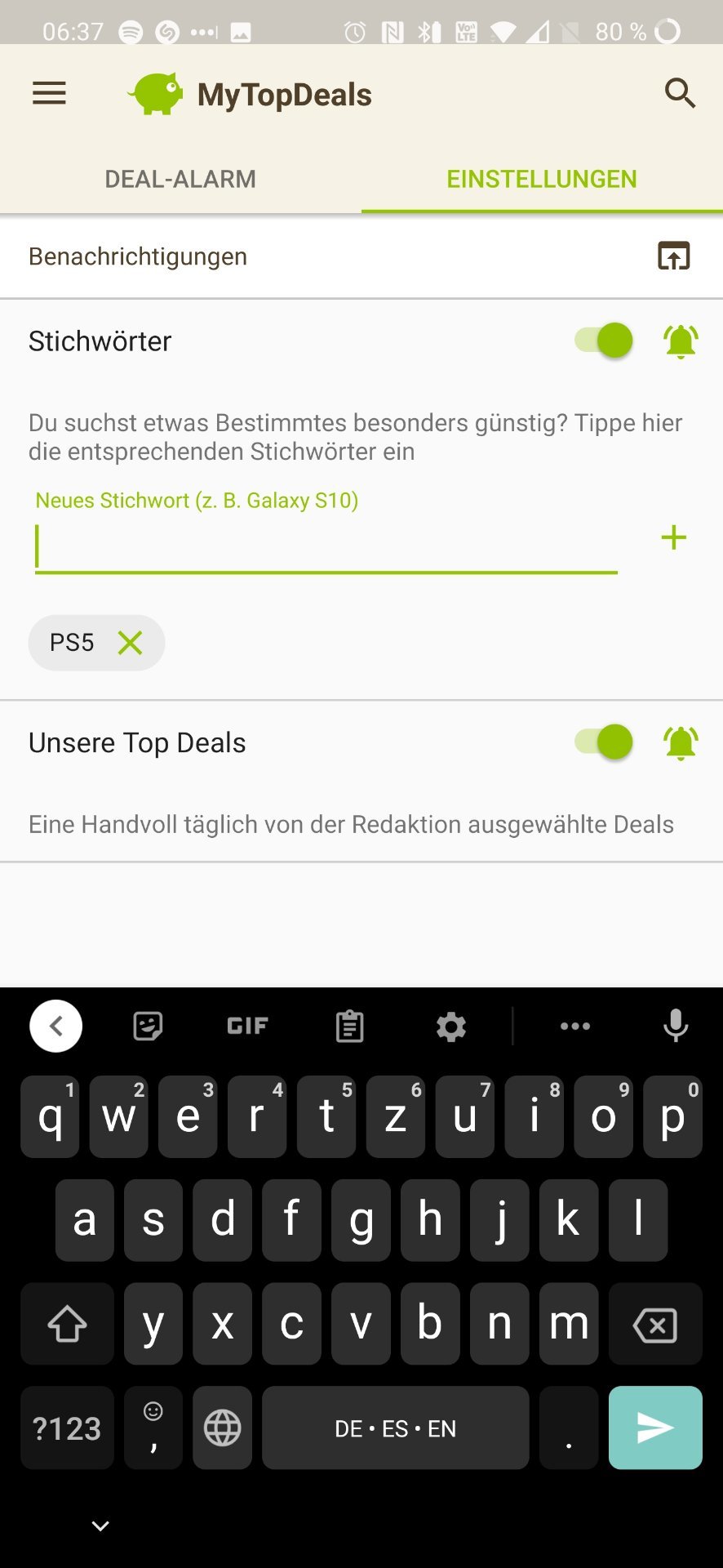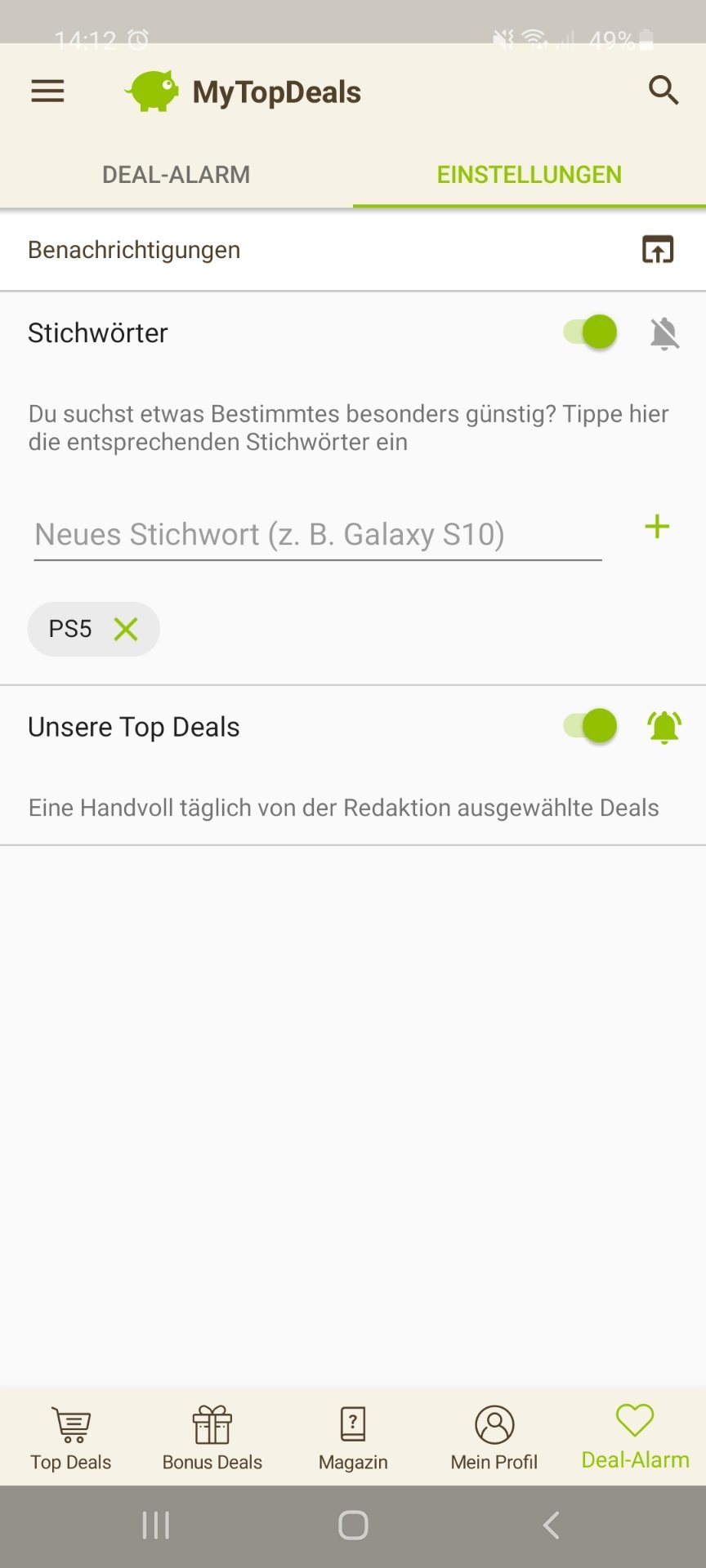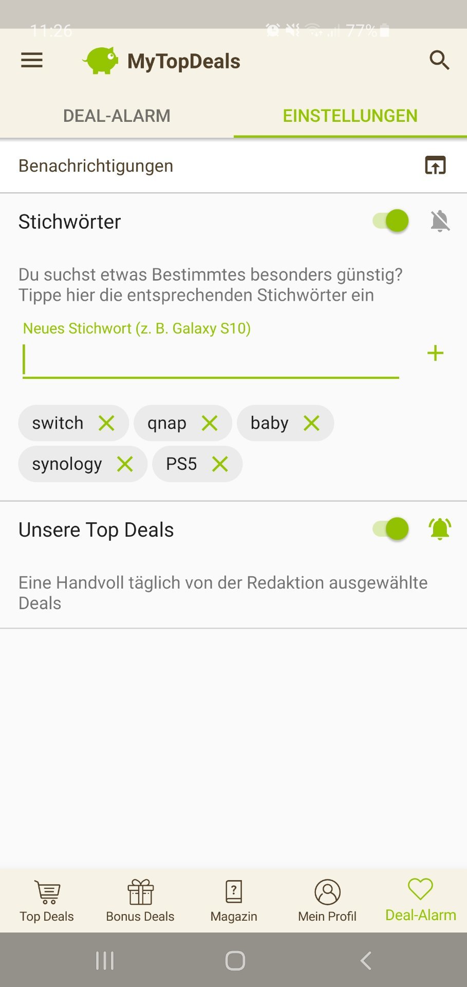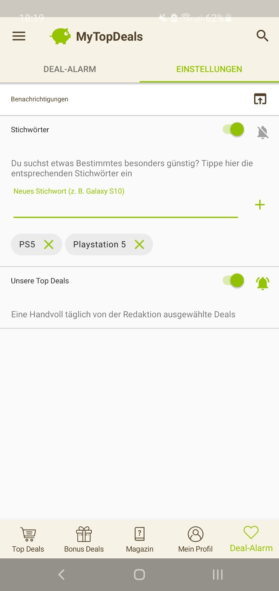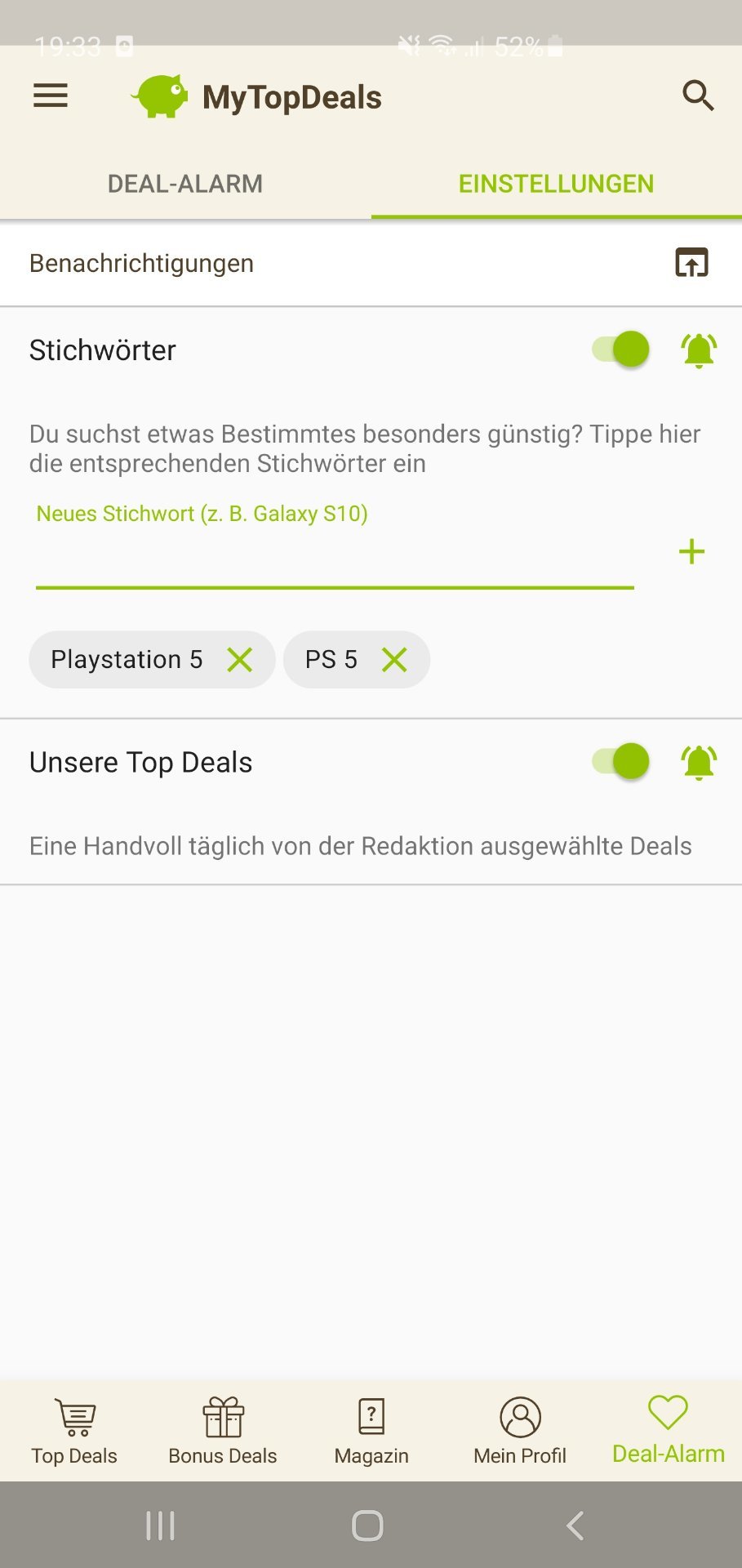 • Android: Deal-Alarm (rechts unten) > Einstellungen > > Stichwort hinzufügen (siehe Screenshot unten)