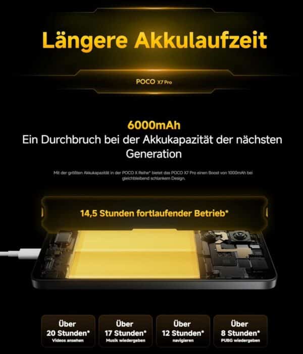 Wer Wert auf lange Nutzungsdauer und schnelles Laden legen, für den hält der 6000mAh Akku des POCO X7 Pro einige Vorteile bereit. Durch die 90W HyperCharge-Technologie, die mit dem Surge P2-Chip arbeitet, sind die Ladezeiten stark verkürzt und das sogar bei kalten Temperaturen. Gleichzeitig bleibt das Design des Handys schlank und handlich.
