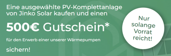 Angebotsumfang: Beim Kauf einer bestimmten PV-Komplettanlage mit Jinko Solarmodulen erhalten Sie einen Gutschein in Höhe von 500 € für den Erwerb einer unserer Wärmepumpen. (Liste der Anlagen siehe Unten)
