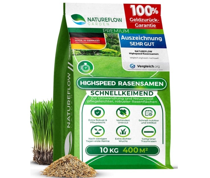 Ein sattgrüner, dichter Rasen ist der Traum jedes Gartenbesitzers. Mit dem Natureflow Garden Highspeed Rasensamen wird dieser Traum zur Realität – und das schneller als man denkt! Der schnellkeimende Rasensamen sorgt dafür, dass ihr bereits nach wenigen Tagen die ersten grünen Halme im Garten bewundern könnt.