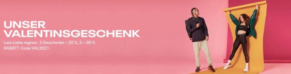 Zum Valentinstag gibt es bei Reebok.de einen sehr amourösen Sale. Deckt euch und euren Partner mit neuen KLamotten oder Sneakern ein und ihr spart 20%. Bei einer Menage a trois gibt’s sogar 30%. Spaß beiseite, der Deal lohnt sich sehr gut um sich von oben bis unten neu auszustatten und richtig Geld zu sparen. Und schon ab nur 25€ wird eure Bestellung kostenlos zu euch nach Hause geliefert. Genial, um mal wieder preiswert sportliche Sneaker, Shirts und mehr einzukaufen!