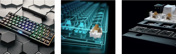 In Sachen Tippgefühl bietet die Tastatur verschiedene vorinstallierte Kailh-Schalter: rote für lineares, braune für taktiles und blaue für klickendes Feedback. Jeder dieser Schalter zeichnet sich durch einen kurzen Auslöseweg von 1,9 Millimetern und eine hohe Lebensdauer von mindestens 70 Millionen Tastenanschlägen aus.