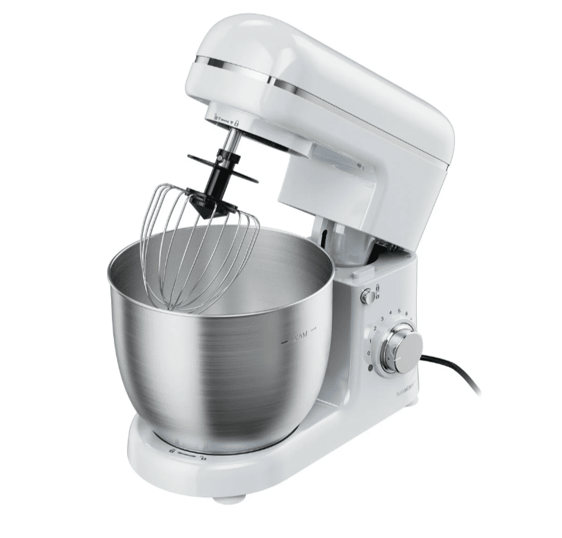 Diese Küchenmaschine ist nicht nur ein leistungsstarker Helfer beim Verarbeiten auch schwerer Teige, sondern auch in der Handhabung sehr komfortabel. Dank des Schwenkarms mit Entriegelungsknopf könnt ihr das Zubehör leicht auswechseln. Der mitgelieferte Spritzschutz mit Einfüllöffnung, Knethaken, Schneebesen und Rührbesen machen die Maschine zu einem echten Allrounder.