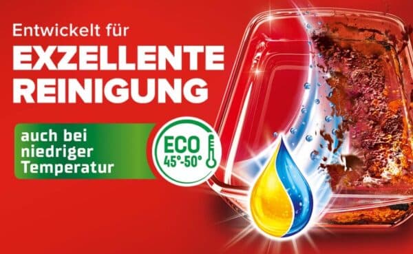 Ein weiterer Pluspunkt ist die Ausrichtung auf Eco-Spülprogramme und niedrige Temperaturen. So könnt ihr Energie sparen und zugleich eine starke Reinigungsleistung genießen. Die hochaktive Anti-Fett-Formel dieses Geschirrspülmittels ermöglicht es euch, bis zu 20 Prozent Energie einzusparen und unterstützt damit sowohl die Umwelt als auch euren Geldbeutel.