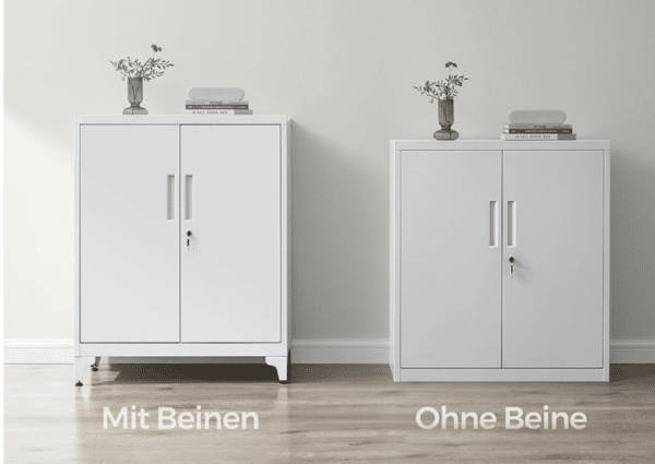 Der Schrank kommt mit einer klaren Anleitung und vorsortierten Teilen, sodass ihr ihn leicht zusammenbauen könnt. Falls euer Boden nicht ganz eben ist, sorgen die optionalen Beine und die verstellbaren Schraubfüße für die nötige Stabilität.