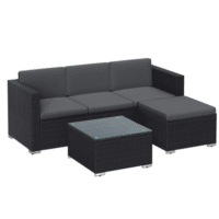 Für Stabilität und Eleganz sorgt die Tischplatte aus Hartglas. Mit 6 cm dicken Kissen auf den großzügigen Sitzplätzen und einem praktischen Couchtisch wird euer Balkon schnell zum zweiten Wohnzimmer im Freien.