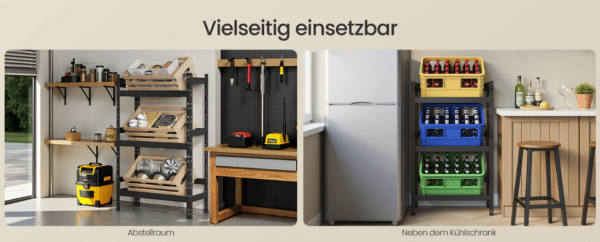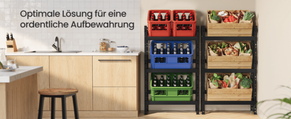 Mit Platz für bis zu 6 Kisten mit 12 Flaschen oder 3 Kisten größeren Umfangs wird eure Lagerung deutlich vereinfacht und übersichtlich. Der Aufbau des Regals ist unkompliziert und schnell, da ihr es innerhalb von circa 10 Minuten ohne zusätzliches Werkzeug nur anhand der beigelegten Anleitung zusammenbauen könnt.