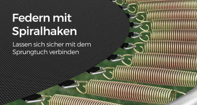 Eine UV- und feuchtigkeitsresistente Randabdeckung schützt dabei nicht nur vor Sonne und Regen, sondern bewahrt auch vor Einklemmen an den Federn. Der Aufbau des Trampolins gestaltet sich durch Arretierungsfedern und gekennzeichnete Teile sehr einfach.