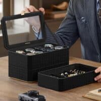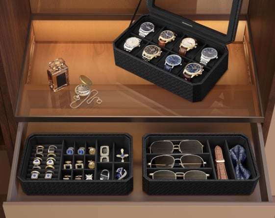 So habt ihr immer die passende Aufbewahrung für verschiedene Accessoires und könnt diese übersichtlich sortieren. Das Innenfutter aus weichem Velourslederimitat verhindert Kratzer, während ein Glasfenster Staub fernhält und gleichzeitig eure Sammlung präsentiert.