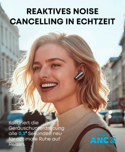 Und dank der sieben Sensoren, einschließlich Luftdrucksensor, erlebt ihr eine effektive Geräuschunterdrückung, die sich alle 0,3 Sekunden anpasst, um euch konstant von lästigen Außengeräuschen zu isolieren. Wenn das Ladecase nicht parat liegen sollte, könnt ihr auch wie gewohnt an den Kopfhörern selbst sowie in der App auf dem Smartphone die Kopfhörer bedienen.