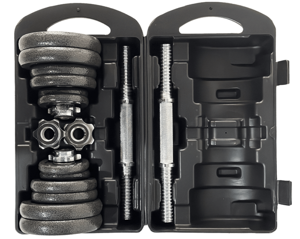 Und das Beste: Alles passt in den praktischen Koffer! So kannst du dein Training ganz easy überallhin mitnehmen. Die Sternverschlüsse und Hantelstangen aus verchromtem Stahl sorgen für sicheren Halt, auch wenn du mal ins Schwitzen kommst.