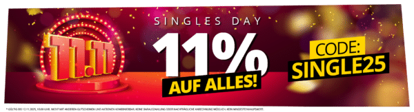 SportSpar feiert den Singles Day und zur Feier des Tages gibt es 11% Rabatt auf alles für euch! Nur solange der Vorrat reicht bekommt ihr hier viele extrem reduzierte Schnäppchen. Und mit dem Gutscheincode SINGLE25 erhaltet ihr sogar nochmal 11% Rabatt auf eure Bestellung – bis morgen früh!