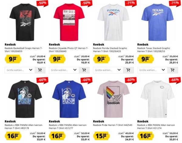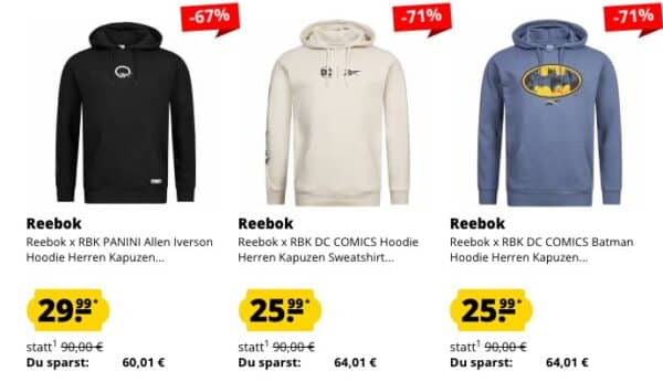 Lust auf neue coole sportliche Kleidung & Schuhe? SportSpar bietet euch einen umfangreichen Reebok Sale, und zwar u.a. mit T-Shirts, Hoodies, Trainings-Kleidung und mehr! Die Auswahl ist gut, nur die beliebten Größen sind vermutlich recht schnell ausverkauft, wie immer. Unten gibt es ein paar Highlights für euch: