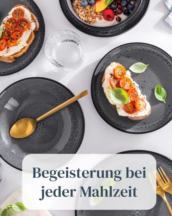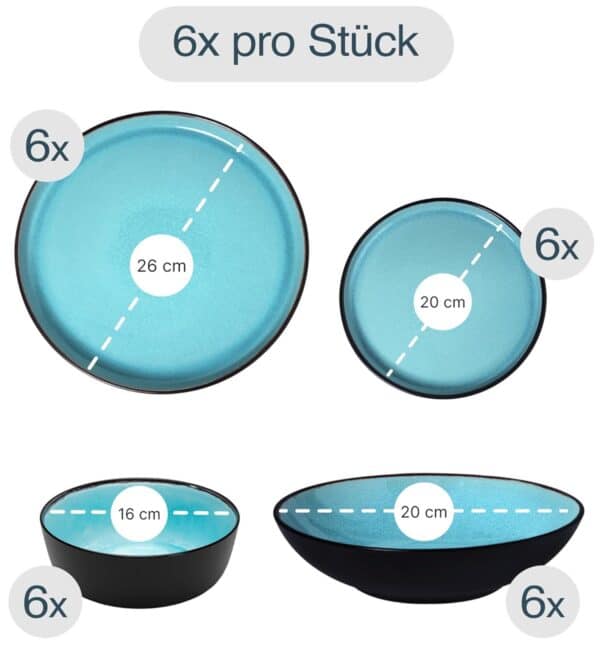 Das Set beinhaltet alles Nötige für bis zu sechs Personen: jeweils 6 Speiseteller, Frühstücksteller, tiefe Teller und Schüsseln, die eure täglichen Mahlzeiten und die Bewirtung von Gästen mit Stil begleiten.