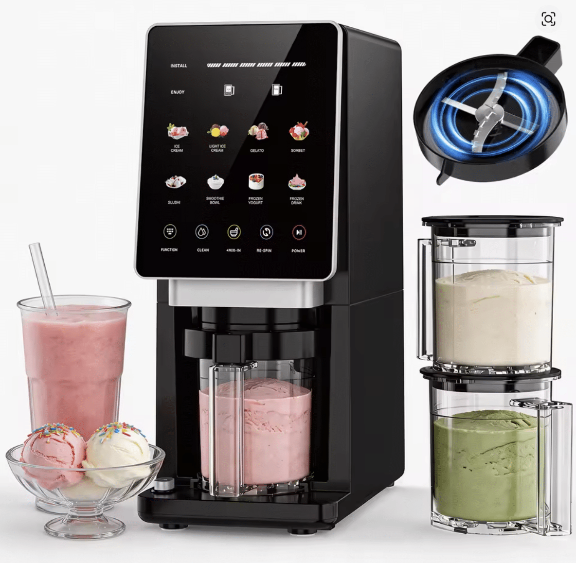 Der integrierte Mix-In Modus erlaubt es euch, Schokolade, Früchte oder Nüsse perfekt unter eure Eismasse zu heben. Sollte die Konsistenz nach dem ersten Durchgang noch nicht perfekt sein, hilft die Re-Spin Funktion für den extra cremigen Kick. Das Gerät ist durch das intuitive Design auch für Anfänger bestens geeignet.