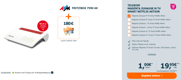 Wer auf der Suche nach einem neuen DSL Tarif ist, der sollte jetzt weiterlesen. Denn bei Logitel gibt es einen echt coolen Deal mit dem Telekom Magenta Zuhause Tarif. Ihr habt dabei die Wahl zwischen M, L und XL. Die ersten 6 Monate zahlt ihr bei allen Tarifen nur 19,95€ mtl. Einmalig fällt 1,00€ an für die FRITZ!BOX 7590 AX