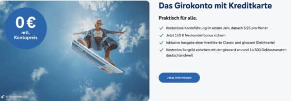 - Kostenlose Kontoführung für 12 Monate im Kontomodell „Girokonto“ (danach gilt der reguläre Preis von 3,95€ mtl.) – gilt für Online-Eröffnung und Filiale.